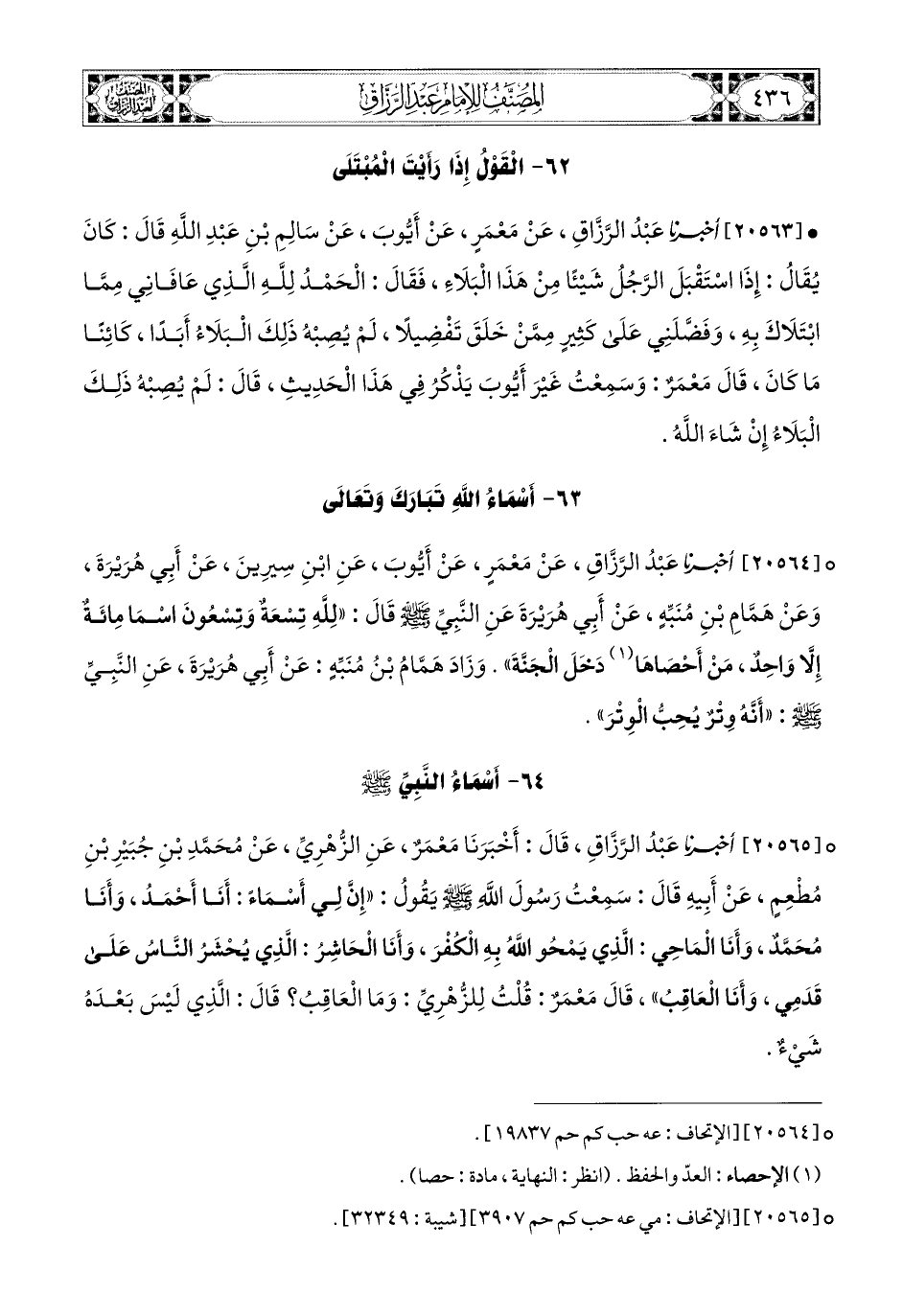 20564- أخبرنا عبد الرزاق، عَنْ مَعْمَرٍ، عَنْ أَيُّوبَ، عَنِ ابْنِ سِيرِينَ، عَنْ أَبِي هُرَيرَةَ، وَعَنْ هَمَّامِ بْنِ مُنَبِّهٍ، عَنْ أَبِي هُرَيرَةَ، عَنِ النَّبِيِّ صَلَّى اللهُ عَلَيْهِ وَسَلَّمَ قَالَ: للهِ تِسْعَةٌ وَتِسْعُونَ اسْمًا، مِئَةٌ إِلاَّ وَاحِدٌ، مَنْ أَحْصَاهَا دَخَلَ الْجَنَّةَ، وَزَادَ هَمَّامُ بن مُنَبِّهٍ: عَنْ أَبِي هُرَيرَةَ، عَنِ النَّبِيِّ صَلَّى اللهُ عَلَيْهِ وَسَلَّمَ؛ أَنَّهُ وِتْرٌ يُحِبُّ الْوِتْرَ.