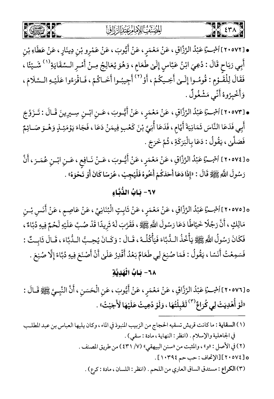 20572- أخبرنا عبد الرزاق، عَنْ مَعْمَرٍ، عَنْ أَيُّوبَ، عَنْ عَمْرِو بنِ دِينَارٍ، عَنْ عَطَاءِ بْنِ أَبِي رَبَاحٍ، قَالَ: دُعِيَ ابْنُ عَبَّاسٍ إِلَى طَعَامٍ، وَهُوَ يُعَالِجُ مِنْ أَمْرِ السِّقَايَةِ شَيْئًا، فَقَالَ لِلْقَوْمِ: قُومُوا إِلَى أَخِيكُمْ، أَوْ أَجِيبُوا أَخَاكُمْ، فَاقْرَؤُوا عَلَيْهِ السَّلاَمَ، وَأَخْبِرُوهُ أَنِّي مَشْغُولٌ.