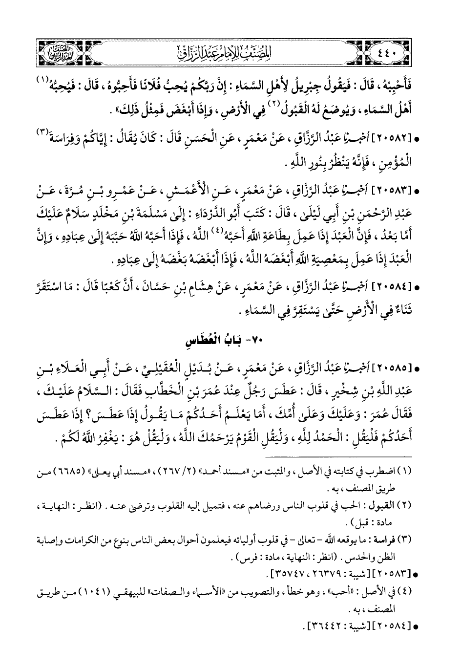 20584- أخبرنا عبد الرزاق، عَنْ مَعْمَرٍ، عَن هِشَامِ بْنِ حَسَّانَ، أَنَّ كَعْبًا قَالَ: مَا اسْتَقَرَّ ثَنَاءٌ فِي الأَرْضِ، حَتَّى يَسْتَقِرَّ فِي السَّمَاءِ.