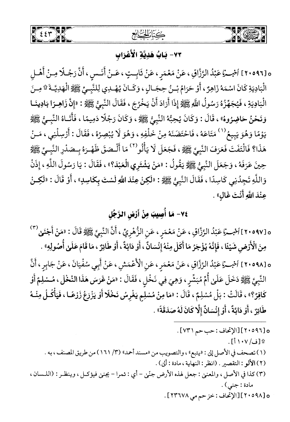 20597- أخبرنا عبد الرزاق، عَنْ مَعْمَرٍ، عَنِ الزُّهْرِيِّ، أَنَّ النَّبِيَّ صَلَّى اللهُ عَلَيْهِ وَسَلَّمَ قَالَ: مَنْ أَجْنَى مِنَ الأَرْضِ شَيْئًا، فَإِنَّهُ يُؤْجَرُ مَا أَكَلَ مِنْهُ إِنْسَانٌ، أَوْ دَابَّةٌ، أَوْ طَائِرٌ، مَا قَامَ عَلَى أُصُولِهِ.