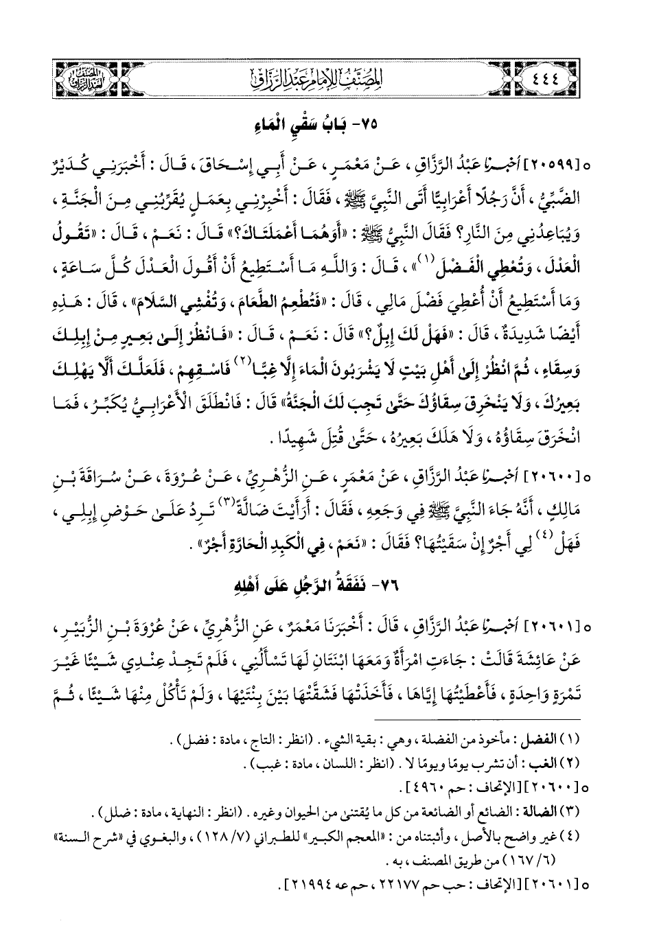 20599- أخبرنا عبد الرزاق، عَنْ مَعْمَرٍ، عَنْ أَبِي إِسْحَاقَ، قَالَ: أَخْبَرَنِي كُدَيْرٌ الضَّبِّيُّ، أَنَّ رَجُلاً أَعْرَابِيًّا أَتَى النَّبِيَّ صَلَّى اللهُ عَلَيْهِ وَسَلَّمَ فَقَالَ: أَخْبِرْنِي بِعَمَلٍ يُقَرِّبُنِي مِنَ الْجَنَّةِ، وَيُبَاعِدُنِي مِنَ النَّارِ؟ فَقَالَ النَّبِيُّ صَلَّى اللهُ عَلَيْهِ وَسَلَّمَ: أَوَهُمَا أَعْمَلَتَاكَ؟ قَالَ: نَعَمْ، قَالَ: تَقُولُ الْعَدْلَ، وَتُعْطِي الْفَضْلَ، قَالَ: وَاللهِ مَا أَسْتَطِيعُ أَنْ أَقُولَ الْعَدْلَ كُلَّ سَاعَةٍ، وَمَا أَسْتَطِيعُ أَنْ أُعْطِيَ فَضْلَ مَالِي، قَالَ: فَتُطْعِمُ الطَّعَامَ، وتُفْشِي السَّلاَمَ، قَالَ: هَذِهِ أَيْضًا شَدِيدَةٌ، قَالَ: فَهَلْ لَكَ إِبِلٌ؟ قَالَ: نَعَمْ، قَالَ: فَانْظُرْ إِلَى بَعِيرٍ مِنْ إِبِلِكَ، وَسِقَاءٍ، ثُمَّ انْظُرْ إِلَى أَهْلِ بَيْتٍ لاَ يَشْرَبُونَ المَاءَ إِلاَّ غِبًّا، فَاسْقِهِمْ، فَلَعَلَّكَ أَلاَّ يَهْلِكَ بَعِيرُكَ، وَلاَ يَنْخَرِقَ سِقَاؤُكَ، حَتَّى تَجِبَ لَكَ الْجَنَّةُ، قَالَ: فَانْطَلَقَ الأَعْرَابِيُّ يُكَبِّرُ، فَمَا انْخَرَقَ سِقَاؤُهُ، وَلاَ هَلَكَ بَعِيرُهُ، حَتَّى قُتِلَ شَهِيدًا.