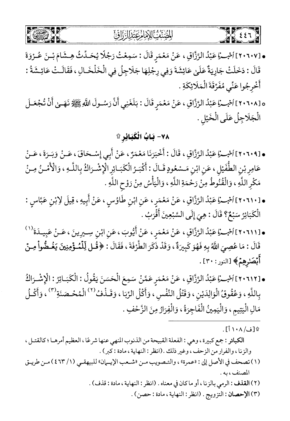 20610- أخبرنا عبد الرزاق، عَنْ مَعْمَرٍ، عَنِ ابْنِ طَاوُوسٍ، عَنْ أَبِيهِ، قِيلَ لاِبْنِ عَبَّاسٍ: الْكَبَائِرُ سَبْعٌ؟ قَالَ: هِيَ إِلَى السَّبْعِينَ أَقْرَبُ.