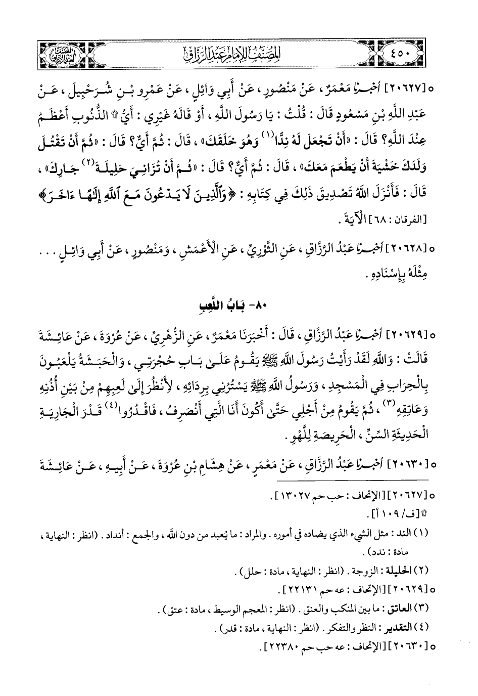 20627- أخبرنا عبد الرزاق، قَالَ: أَخْبَرَنَامَعْمَرٍ، عَنْ مَنصُورٍ، عَنْ أَبِي وَائِلٍ، عَنْ عَمْرِو بنِ شُرَحْبِيلَ، عَنْ عَبدِ اللهِ بْنِ مَسْعُودٍ، قَالَ: قُلْتُ: يَا رَسُولَ اللهِ، أَوْ قَالَهُ غَيْرِي: أَيُّ الذُّنُوبِ أَعْظَمُ عِنْدَ اللهِ؟ قَالَ: أَنْ تَجْعَلَ لَهُ نِدًّا وَهُوَ خَلَقَكَ، قَالَ: ثُمَّ أَيُّ؟ قَالَ: ثُمَّ أَنْ تَقْتُلَ وَلَدَكَ، خَشْيَةَ أَنْ يَطْعَمَ مَعَكَ، قَالَ: ثُمَّ أَيُّ؟ قَالَ: ثُمَّ أَنْ تُزَانِيَ حَلِيلَةَ جَارِكَ، قَالَ: فَأَنْزَلَ اللهُ تَصْدِيقَ ذَلِكَ فِي كِتَابِهِ: {وَالَّذِينَ لاَ يَدْعُونَ مَعَ اللهِ إِلَهًا آخَرَ} الآيَةَ.