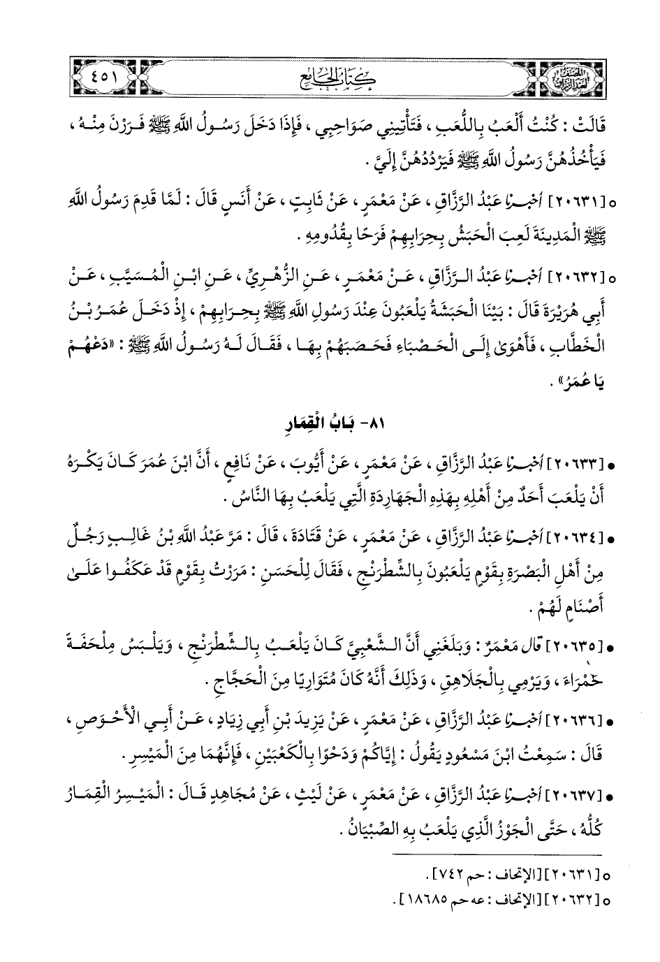 20632- أخبرنا عبد الرزاق، عَنْ مَعْمَرٍ، عَنِ الزُّهْرِيِّ، عَنِ ابْنِ المُسَيَّبِ، عَنْ أَبِي هُرَيرَةَ، قَالَ: بَيْنَا الْحَبَشَةُ يَلْعَبُونَ عِنْدَ رَسُولِ اللهِ صَلَّى اللهُ عَلَيْهِ وَسَلَّمَ بِحِرَابِهِمْ، إِذْ دَخَلَ عُمَرُ بن الْخَطَّابِ، فَأَهْوَى إِلَى الْحَصْبَاءِ، فَحَصَبَهُمْ بِهَا، فَقَالَ لَهُ رَسُولُ اللهِ صَلَّى اللهُ عَلَيْهِ وَسَلَّمَ: دَعْهُمْ يَا عُمَرُ.