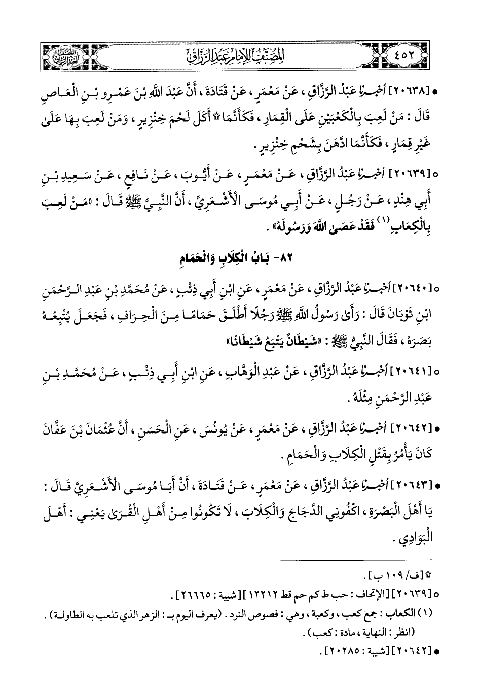 20638- أخبرنا عبد الرزاق، عَنْ مَعْمَرٍ، عَن قَتَادَةَ، أَنَّ عَبدَ اللهِ بن عَمْرِو بنِ الْعَاصِ قَالَ: مَنْ لَعِبَ بِالْكَعْبَيْنِ عَلَى الْقِمَارِ، فَكَأَنَّمَا أَكَلَ لَحْمَ خِنْزِيرٍ، وَمَنْ لَعِبَ بِهَا عَلَى غَيْرِ قِمَارٍ، فَكَأَنَّمَا ادَّهَنَ بِشَحْمِ خِنْزِيرٍ.