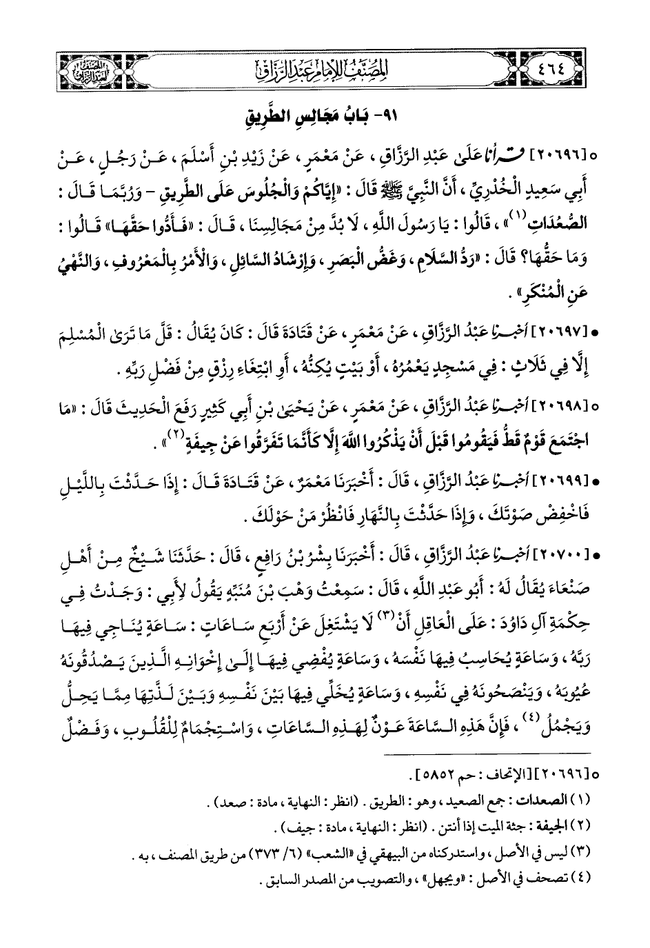 20696- قَرَأْنَا عَلَى عَبْدِ الرَّزَّاقِ، عَنْ مَعْمَرٍ، عَن زَيْدِ بْنِ أَسْلَمَ، عَن رَجُلٍ، عَنْ أَبِي سَعيدٍ الْخُدْرِيِّ، أَنَّ النَّبِيَّ صَلَّى اللهُ عَلَيْهِ وَسَلَّمَ قَالَ: إِيَّاكُمْ وَالْجُلُوسَ عَلَى الطَّرِيقِ، وَرُبَّمَا قَالَ: الصُّعُدَاتِ، قَالُوا: يَا رَسُولَ اللهِ، لاَ بُدَّ مِنْ مَجَالِسِنَا، قَالَ: فَأَدُّوا حَقَّهَا، قَالُوا: وَمَا حَقُّهَا؟ قَالَ: رَدُّ السَّلاَمِ، وَغَضُّ الْبَصَرِ، وَإِرْشَادُ السَّائِلِ، وَالأَمْرُ بِالمَعْرُوفِ، وَالنَّهْيُ عَنِ المُنْكَرِ.