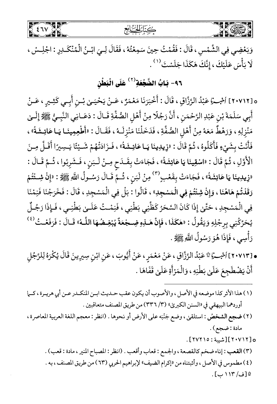 20712- أخبرنا عبد الرزاق، قَالَ: أَخْبَرَنَا مَعْمَرٌ، عَن يَحيَى بنِ أَبِي كَثِيرٍ، عَنْ أَبِي سَلَمَةَ بْنِ عَبدِ الرَّحْمَنِ، أَنَّ رَجُلاً مِنْ أَهْلِ الصُّفَّةِ قَالَ: دَعَانِي النَّبِيُّ صَلَّى اللهُ عَلَيْهِ وَسَلَّمَ إِلَى مَنْزِلِهِ، وَرَهْطٌ مَعَهُ مِنْ أَهْلِ الصُّفَّةِ، فَدَخَلْنَا مَنْزِلَهُ، فَقَالَ: أَطْعِمِينَا يَا عَائِشَةُ، فَأَتَتْ بِشَيْءٍ فَأَكَلُوهُ، ثُمَّ قَالَ: زِيدِينَا يَا عَائِشَةُ، فَزَادَتْهُمْ شَيْئًا يَسِيرًا، أَقَلَّ مِنَ الأَوَّلِ، ثُمَّ قَالَ: اسْقِينَا يَا عَائِشَةُ، فَجَاءَتْ بِقَدَحٍ مِنْ لَبَنٍ، فَشَرِبُوا، ثُمَّ قَالَ: زِيدِينَا يَا عَائِشَةُ، فَجَاءَتْ بِقَعْبٍ مِنْ لَبَنٍ، ثُمَّ قَالَ رَسُولُ اللهِ صَلَّى اللهُ عَلَيْهِ وَسَلَّمَ: إِنْ شِئْتُمْ رَقَدْتُمْ هَاهُنَا، وَإِنْ شِئْتُمْ فِي المَسْجِدِ، قَالُوا: بَلْ فِي المَسْجِدِ، قَالَ: فَخَرَجْنَا، فَنِمْنَا فِي المَسْجِدِ، حَتَّى إِذَا كَانَ السَّحَرُ، كَظَّنِي بَطْنِي، فَنِمْتُ عَلَى بَطْنِي، فَإِذَا رَجُلٌ يُحَرِّكُنِي بِرِجْلِهِ وَيَقُولُ: هَكَذَا، فَإِنَّ هَذِهِ ضِجْعَةٌ يُبْغِضُهَا اللهُ، قَالَ: فَرَفَعْتُ رَأْسِي، فَإِذَا هُوَ رَسُولُ اللهِ صَلَّى اللهُ عَلَيْهِ وَسَلَّمَ.