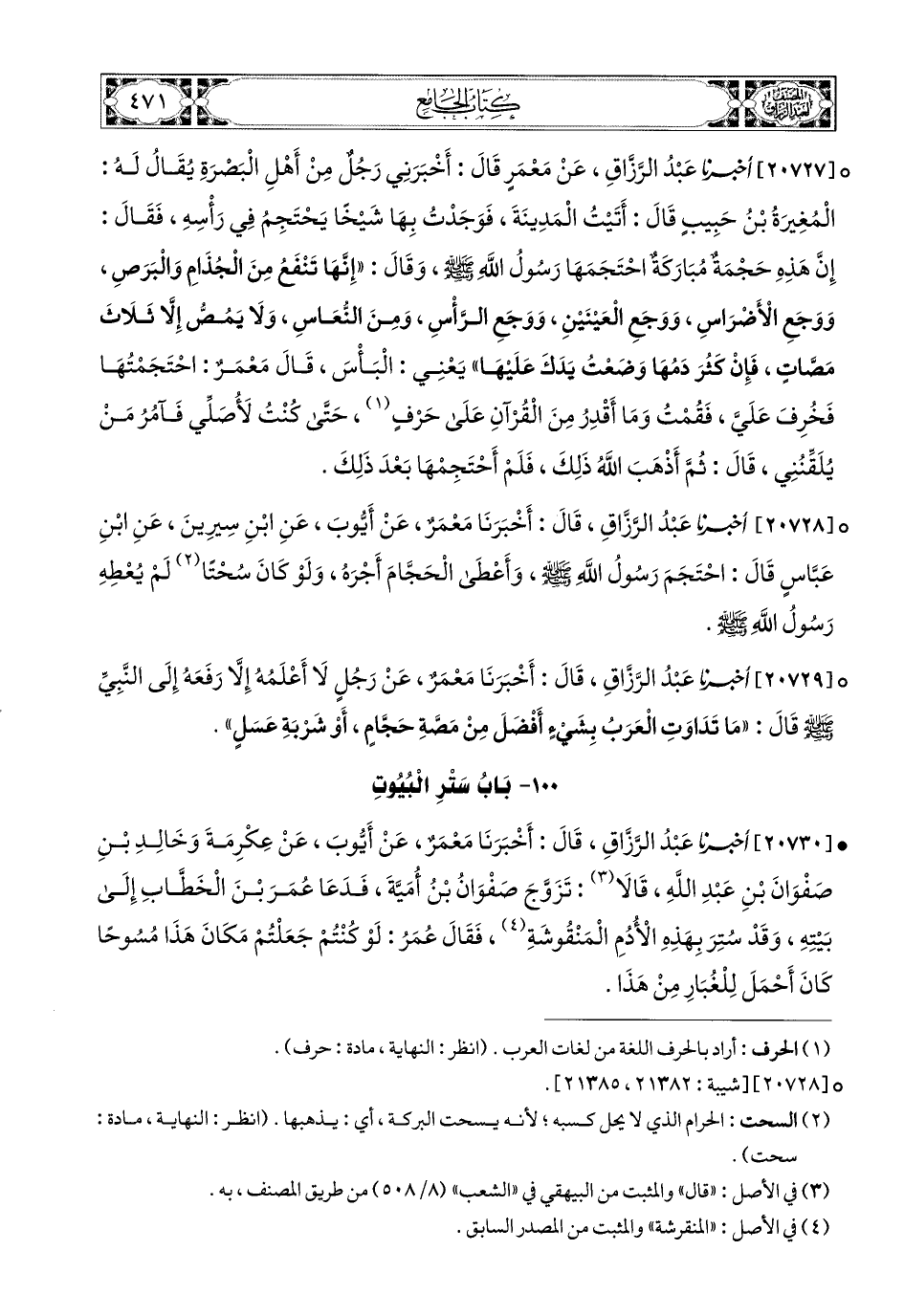 20727- أخبرنا عبد الرزاق، عَنْ مَعْمَرٍ، قَالَ: أَخْبَرَنِي رَجُلٌ مِنْ أَهْلِ الْبَصْرَةِ يُقَالُ لَهُ: المُغِيرَةُ بن حَبِيبٍ، قَالَ: أَتَيْتُ المَدِينَةَ، فَوَجَدْتُ بِهَا شَيْخًا يَحْتَجِمُ فِي رَأْسِهِ، فَقَالَ: إِنَّ هَذِهِ حَجْمَةٌ مُبَارَكَةٌ احْتَجَمَهَا رَسُولُ اللهِ صَلَّى اللهُ عَلَيْهِ وَسَلَّمَ، وَقَالَ: إِنَّهَا تَنْفَعُ مِنَ الْجُذَامِ، وَالْبَرَصِ، وَوَجَعِ الأَضْرِاسِ، وَوَجَعِ الْعَيْنَيْنِ، وَوَجَعِ الرَّأْسِ، وَمِنَ النُّعَاسِ، وَلاَ يَمُصُّ إِلاَّ ثَلاَثَ مصَّاتٍ، فَإِنْ كَثُرَ دَمُهَا، وَضَعْتَ يَدَكَ عَلَيْهَا، يَعْنِي الْبَأْسَ.