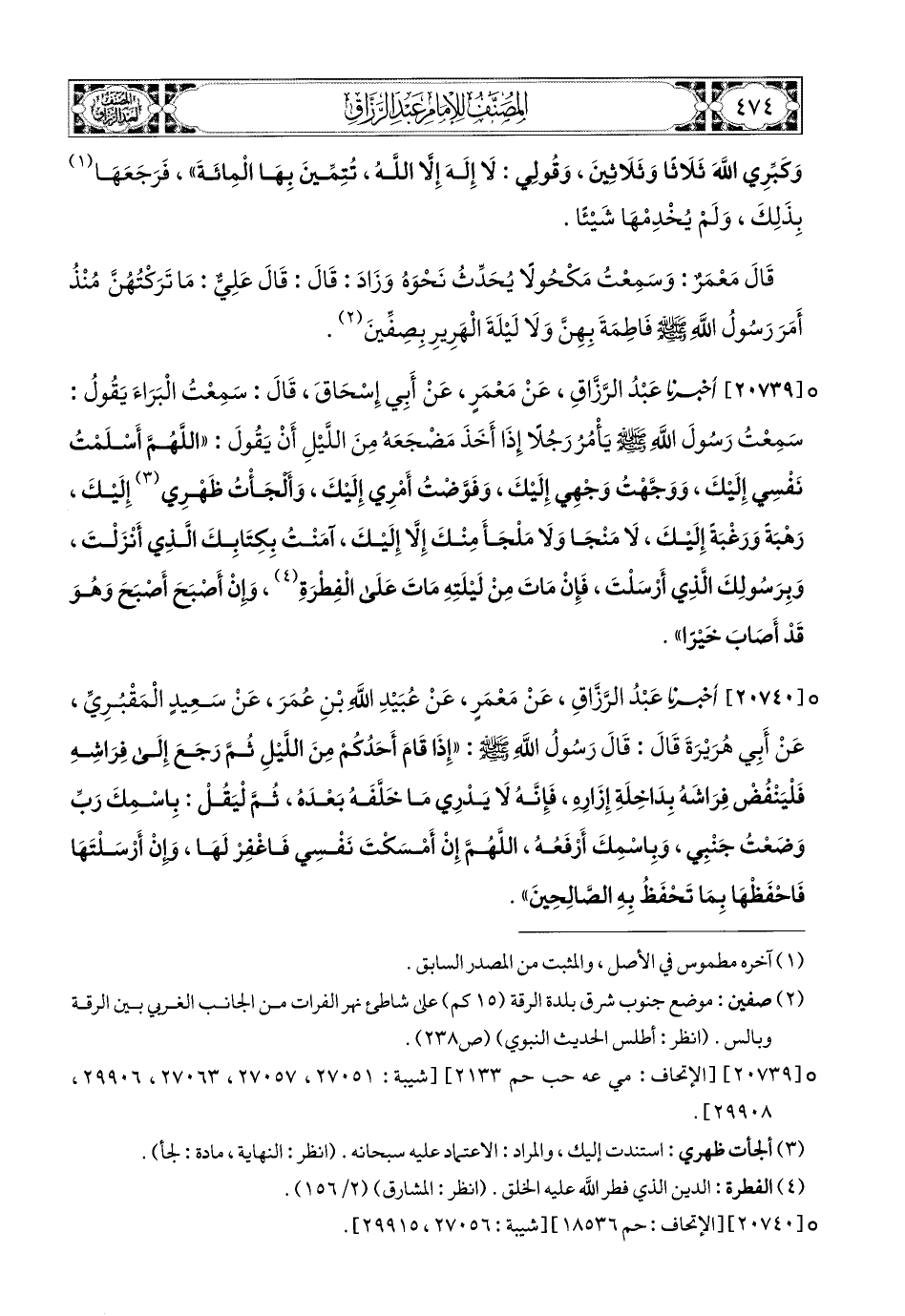 20739- أخبرنا عبد الرزاق، عَنْ مَعْمَرٍ، عَنْ أَبِي إِسْحَاقَ، قَالَ: سَمِعْتُ الْبَرَاءَ يَقُولُ: سَمِعْتُ رَسُولَ اللهِ صَلَّى اللهُ عَلَيْهِ وَسَلَّمَ يَأْمُرُ رَجُلاً إِذَا أَخَذَ مَضْجَعَهُ مِنَ اللَّيْلِ أَنْ يَقُولَ: اللهُمَّ أَسْلَمْتُ نَفْسِي إِلَيْكَ، وَوَجَّهْتُ وَجْهِي إِلَيْكَ، وَفَوَّضْتُ أَمْرِي إِلَيْكَ، وَأَلْجَأْتُ ظَهْرِي إِلَيْكَ، رَهْبَةً وَرَغْبَةً إِلَيْكَ، لاَ مَنْجَا وَلاَ مَلْجَأَ مِنْكَ إِلاَّ إِلَيْكَ، آمَنْتُ بِكِتَابِكَ الَّذِي أَنْزَلْتَ، وَبِرَسُولِكَ الَّذِي أَرْسَلْتَ، فَإِنْ مَاتَ مِنْ لَيْلَتِهِ مَاتَ عَلَى الْفِطْرَةِ، وَإِنْ أَصْبَحَ أَصْبَحَ وَهُوَ قَدْ أَصَابَ خَيْرًا.