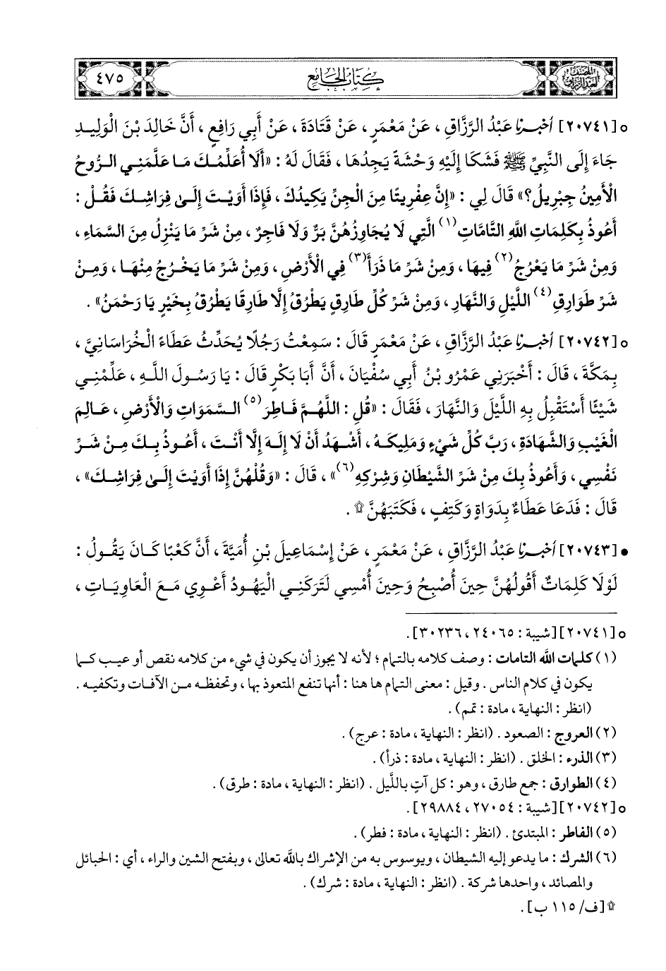 20743- أخبرنا عبد الرزاق، عَنْ مَعْمَرٍ، عَن إِسْمَاعِيلَ بْنِ أُمَيَّةَ، أَنَّ كَعْبًا كَانَ يَقُولُ: لَوْلاَ كَلِمَاتٌ أَقُولُهُنَّ حِينَ أُصْبِحُ وَحِينَ أُمْسِي لَتَرَكَنِي الْيَهُودُ أَعْوِي مَعَ الْعَاوِيَاتِ، وَأَنِيحُ مَعَ النَّايِحَاتِ: أَعُوذُ بِكَلِمَاتِ اللهِ التَّامَّةِ، الَّتِي لاَ يُجَاوِزُهُنَّ بَرٌّ وَلاَ فَاجِرٌ، الَّذِي لاَ يُخْفِرُ جَارَهُ، الَّذِي يُمْسِكُ السَّمَاءَ أَنْ تَقَعَ عَلَى الأَرْضِ إِلاَّ بِإِذْنِهِ مِنْ شَرِّ مَا خَلَقَ، وَذَرَأَ وَبَرَأَ.