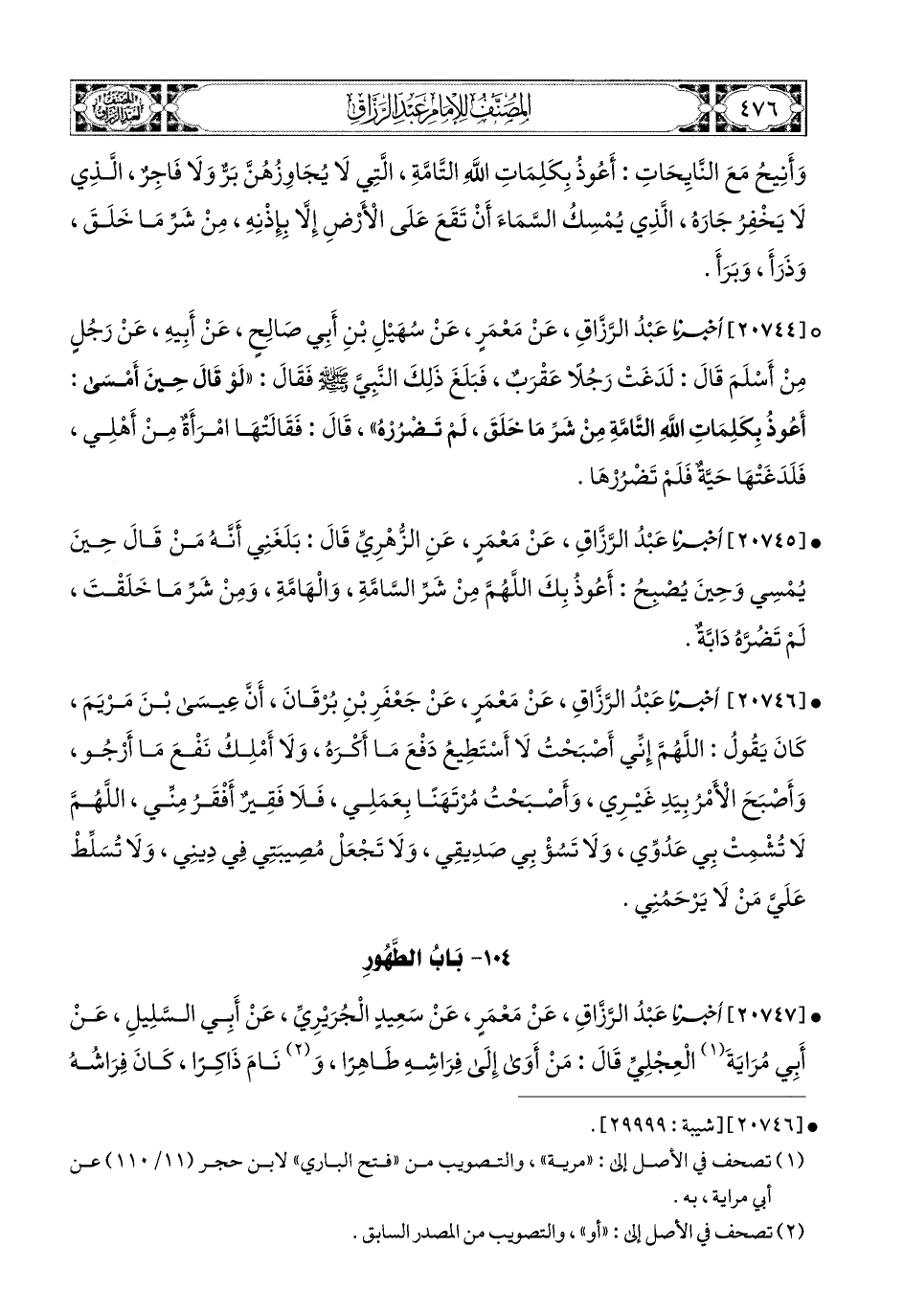 20744- أخبرنا عبد الرزاق، عَنْ مَعْمَرٍ، عَن سُهَيْلِ بْنِ أَبِي صَالِحٍ، عَنْ أَبِيهِ، عَن رَجُلٍ مِنْ أَسْلَمَ، قَالَ: لَدَغَتْ رَجُلاً عَقْرَبٌ، فَبَلَغَ ذَلِكَ النَّبِيَّ صَلَّى اللهُ عَلَيْهِ وَسَلَّمَ فَقَالَ: لَوْ قَالَ حِينَ أَمْسَى: أَعُوذُ بِكَلِمَاتِ اللهِ التَّامَّةِ مِنْ شَرِّ مَا خَلَقَ، لَمْ تَضررهُ، قَالَ: فَقَالَتْهَا امْرَأَةٌ مِنْ أَهْلِي، فَلَدَغَتْهَا حَيَّةٌ، فَلَمْ تَضررهَا.