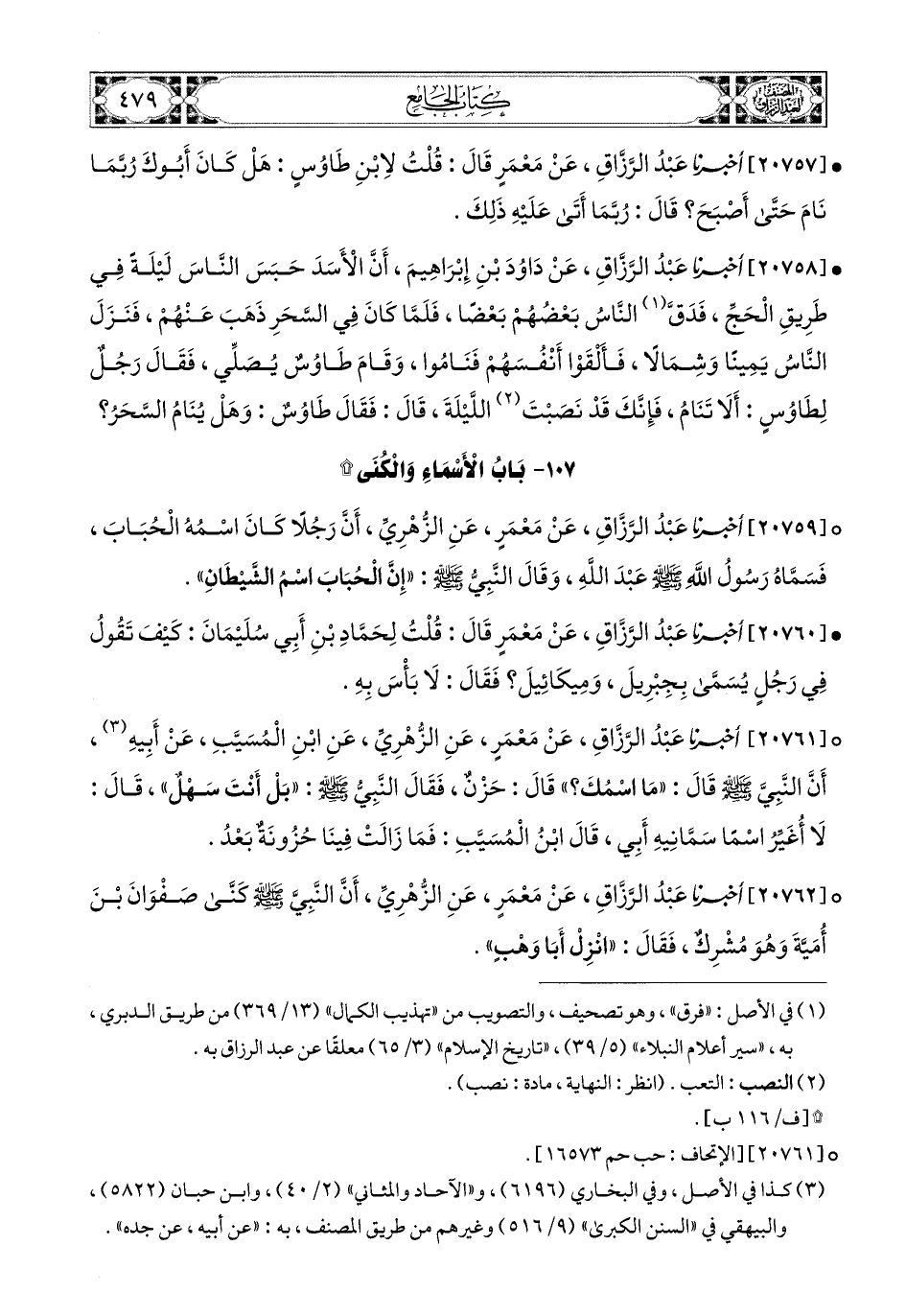 20759- أخبرنا عبد الرزاق، عَنْ مَعْمَرٍ، عَنِ الزُّهْرِيِّ، أَنَّ رَجُلاً كَانَ اسْمُهُ: الْحُبَابَ، فَسَمَّاهُ رَسُولُ اللهِ صَلَّى اللهُ عَلَيْهِ وَسَلَّمَ: عَبدَ اللهِ، وَقَالَ النَّبِيُّ صَلَّى اللهُ عَلَيْهِ وَسَلَّمَ: إِنَّ الْحُبَابَ اسْمُ الشَّيْطَانِ.