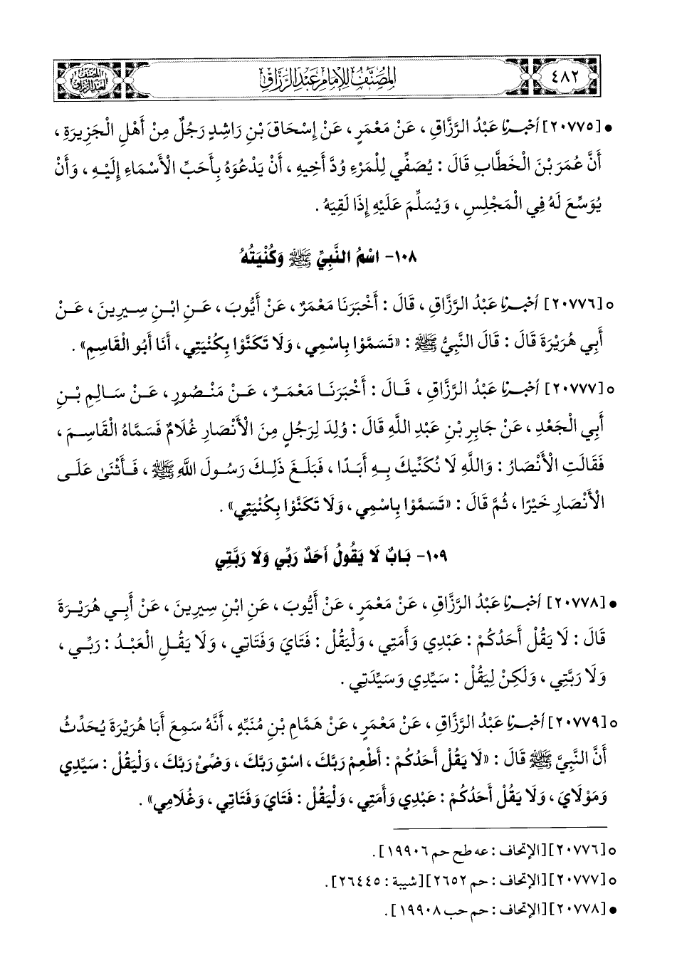 20776- أخبرنا عبد الرزاق، قَالَ: أَخْبَرَنَا مَعْمَرٌ، عَنْ أَيُّوبَ، عَنِ ابْنِ سِيرِينَ، عَنْ أَبِي هُرَيرَةَ، قَالَ: قَالَ النَّبِيُّ صَلَّى اللهُ عَلَيْهِ وَسَلَّمَ: تَسَمَّوْا بِاسْمِي، وَلاَ تَكَنَّوْا بِكُنْيَتِي، أَنَا أَبو الْقَاسِمِ.