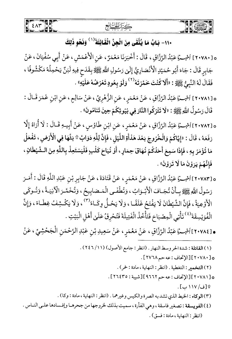20783- أخبرنا عبد الرزاق، عَنْ مَعْمَرٍ، عَن قَتَادَةَ، عَن جَابِرِ بْنِ عَبدِ اللهِ، قَالَ: أَمَرَ رَسُولُ اللهِ صَلَّى اللهُ عَلَيْهِ وَسَلَّمَ بِأَنْ تُجَافَ الأَبْوَابُ، وتُطْفَى المَصَابِيحُ، وَتُخَمَّرَ الآنِيَةُ، وَتُوكَى الأَوْعِيَةُ، فَإِنَّ الشَّيْطَانَ لاَ يَفْتَحُ غَلَقًا، وَلاَ يَحِلُّ وِكَاءً، وَلاَ يَكْشِفُ غِطَاءً، وَإِنَّ الْفُوَيْسِقَةَ تَأْتِي المِصْبَاحَ، فَتَأْخُذُ الْفَتِيلَةَ، فَتُحَرِّقُ عَلَى أَهْلِ الْبَيْتِ.