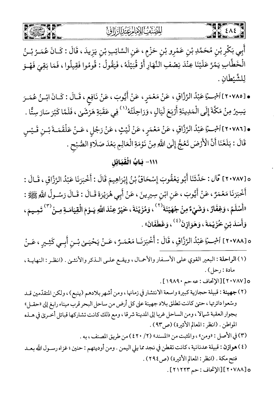 20788- أخبرنا عبد الرزاق، قَالَ: أَخْبَرَنَا مَعْمَرٌ، عَن يَحيَى بنِ أَبِي كَثِيرٍ، عَنْ أَبِي هَمَّامٍ الشَّعْبَانِيِّ، عَن رَجُلٍ مِنْ خَثْعَمٍ، مِنْ أَصْحَابِ رَسُولِ اللهِ صَلَّى اللهُ عَلَيْهِ وَسَلَّمَ، قَالَ: كُنَّا مَعَ النَّبِيِّ صَلَّى اللهُ عَلَيْهِ وَسَلَّمَ فِي غَزْوَةِ تَبُوكَ، فَوَقَفَ ذَاتَ لَيْلَةٍ، وَاجْتَمَعَ إِلَيْهِ أَصْحَابُهُ، فَقَالَ: إِنَّ اللهَ أَعْطَانِي الْكَنْزَيْنِ: كَنْزَ فَارِسَ وَالرُّومِ، وَأَيَّدَنِي بِالمُلُوكِ، مُلُوكِ حِمْيَرَ، وَلاَ مُلْكَ إِلاَّ للهِ، يَأْتُونَ، فَيَأْخُذُونَ مَالَ اللهِ، وَيُقَاتِلُونَ فِي سَبِيلِ اللهِ.