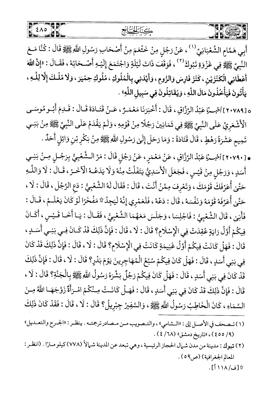 20790- أخبرنا عبد الرزاق، عَنْ مَعْمَرٍ، عَن رَجُلٍ، قَالَ: مَرَّ الشَّعْبِيُّ بِرَجُلٍ مِنْ بَنِي أَسَدٍ، وَرَجُلٍ مِنْ قَيْسٍ، فَجَعَلَ الأَسَدِيُّ يَتَفَلَّتُ مِنْهُ، وَلاَ يَدَعُهُ الآخَرُ، قَالَ: لاَ وَاللهِ، حَتَّى أُعَرِّفَكَ قَوْمَكَ، وَتَعْرِفَ مِمَّنْ أَنْتَ، قَالَ: فَقَالَ لَهُ الشَّعْبِيُّ: دَعِ الرَّجُلَ، قَالَ: لاَ، حَتَّى أُعَرِّفَهُ قَوْمَهُ وَنَفْسَهُ، قَالَ: دَعْهُ فَلَعَمْرِي إِنَّهُ لَيَجِدُ مَفْخَرًا لَوْ كَانَ يَعْلَمُ، قَالَ: فَأَبَى، قَالَ الشَّعْبِيُّ: فَاجْلِسَا، وَجَلَسَ مَعَهُمَا الشَّعْبِيُّ، فَقَالَ: يَا أَخَا قَيْسٍ، أَكَانَ فِيكُمْ أَوَّلُ رَايَةٍ عُقِدَتْ فِي الإِسْلاَمِ؟ قَالَ: لاَ، قَالَ: فَإِنَّ ذَلِكَ قَدْ كَانَ فِي بَنِي أَسَدٍ، قَالَ: فَهَلْ كَانَتْ فِيكُمْ أَوَّلُ غَنِيمَةٍ كَانَتْ فِي الإِسْلاَمِ؟ قَالَ: لاَ، قَالَ: فَإِنَّ ذَلِكَ قَدْ كَانَ فِي بَنِي أَسَدٍ، قَالَ: فَهَلْ كَانَ فِيكُمْ سُبُعُ المُهَاجِرِينَ يَوْمَ بَدْرٍ؟ قَالَ: لاَ، قَالَ: فَإِنَّ ذَلِكَ قَدْ كَانَ فِي بَنِي أَسَدٍ، قَالَ: فَهَلْ كَانَ فِيكُمْ رَجُلٌ بَشَّرَهُ رَسُولُ اللهِ صَلَّى اللهُ عَلَيْهِ وَسَلَّمَ بِالْجَنَّةِ؟ قَالَ: لاَ، قَالَ: فَإِنَّ ذَلِكَ قَدْ كَانَ فِي بَنِي أَسَدٍ، قَالَ: فَهَلْ كَانَتْ مِنْكُمُ امْرَأَةٌ زَوَّجَهَا اللهُ مِنَ السَّمَاءِ، كَانَ الْخَاطِبُ رَسُولَ اللهِ صَلَّى اللهُ عَلَيْهِ وَسَلَّمَ، وَالسَّفِيرُ جِبْرِيلَ؟ قَالَ: لاَ، قَالَ: فَقَدْ كَانَ ذَلِكَ فِي بَنِي أَسَدٍ، خَلِّ عَنِ الرَّجُلِ، فَلَعَمْرِي إِنَّهُ لَيَجِدُ مَفْخَرًا، لَوْ كَانَ يَعْلَمُ، قَالَ: فَانْطَلَقَ الرَّجُلُ وَتَرَكَهُ.
