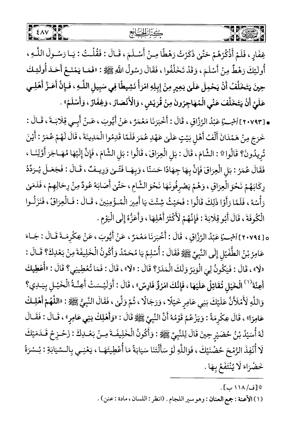20794- أَخبَرَنا عَبدُ الرَّزَّاقِ، قَالَ: أَخْبَرَنَا مَعْمَرٌ، عَنْ أَيُّوبَ، عَنْ عِكْرِمَةَ، قَالَ: جَاءَ عَامِرُ بن الطُّفَيْلِ إِلَى النَّبِيِّ صَلَّى اللهُ عَلَيْهِ وَسَلَّمَ فَقَالَ: أُسْلِمُ يَا مُحَمَّدُ، وَأَكُونُ الْخَلِيفَةَ مِنْ بَعْدِكَ؟ قَالَ: لاَ، قَالَ: فَيَكُونُ لِي الْوَبَرُ، وَلَكَ المَدَرُ؟ قَالَ: لاَ، قَالَ: فَمَا تُعْطِينِي؟ قَالَ: أُعْطِيكَ أَعِنَّةَ الْخَيْلِ، تُقَاتِلُ عَلَيْهَا، فَإِنَّكَ امْرُؤٌ فَارِسٌ، قَالَ: أَوَلَيْسَتْ أَعِنَّةُ الْخَيْلِ بِيَدِي؟ وَاللهِ لأَمْلأَنَّ عَلَيْكَ بَنِي عَامِرٍ خَيْلاً، وَرِجَالاً، ثُمَّ وَلَّى، فَقَالَ النَّبِيُّ صَلَّى اللهُ عَلَيْهِ وَسَلَّمَ: اللهُمَّ أَهْلِكْ عَامِرًا، قَالَ عِكْرِمَةُ: وَيَزْعُمُ قَوْمُهُ أَنَّ النَّبِيَّ صَلَّى اللهُ عَلَيْهِ وَسَلَّمَ قَالَ: وَأَهْلِكْ بَنِي عَامِرٍ، قَالَ: فَقَالَ لَهُ أُسَيْدُ بن حُضَيْرٍ حِينَ قَالَ لِلنَّبِيِّ صَلَّى اللهُ عَلَيْهِ وَسَلَّمَ: وَأَكُونُ الْخَلِيفَةَ مِنْ بَعْدِكَ: زَحْزِحْ قَدَمَيْكَ، لاَ أُنْفِذَ الرُّمْحَ حُضْنَيْكَ، فَوَاللهِ لَوْ سَأَلْتَنَا سَيَابَةً مَا أُعْطِيتَهَا، يَعْنِي بِالسَّيَابَةِ: بُسْرَةً خَضْرَاءَ، لاَ يُنْتَفَعُ بِهَا.