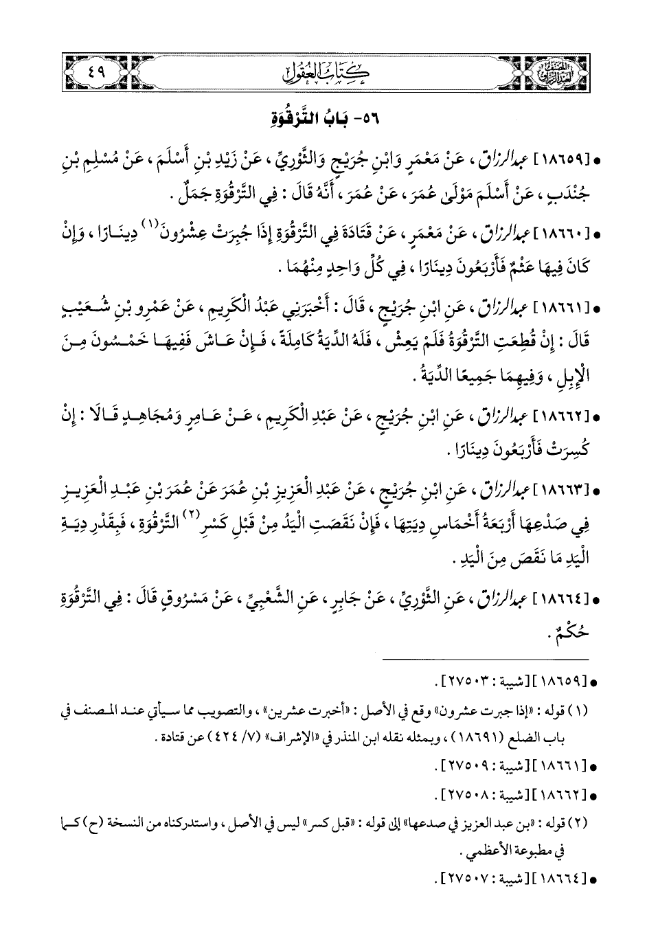 18661- عبد الرزاق، عَنِ ابْنِ جُرَيْجٍ، قَالَ: أَخْبَرَنِي (1) عَبدُ الْكَرِيمِ، عَنْ عَمْرِو بنِ شُعَيْبٍ، قَالَ: إِنْ قُطِعَتِ التَّرْقُوَةُ، فَلَمْ يَعِشْ، فَلَهُ الدِّيَةُ كَامِلَةً، فَإِنْ عَاشَ فَفِيهَا خَمْسُونَ مِنَ الإِبِلِ، وَفِيهِمَا جَمِيعًا الدِّيَةُ.