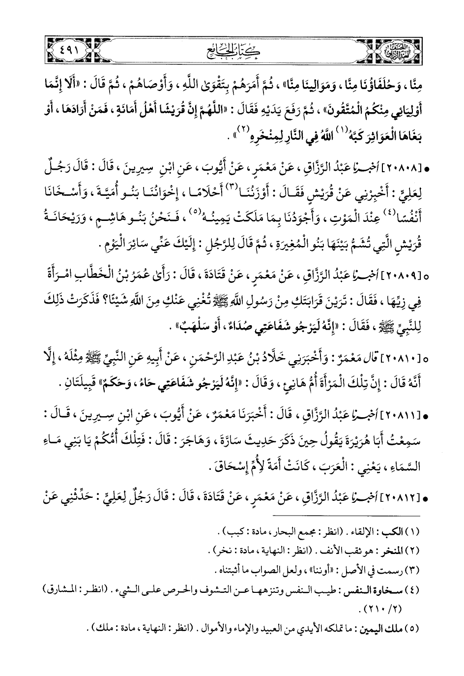 20810- قَالَ مَعْمَرٌ: وَأَخْبَرَنِي خَلاَّدُ بن عَبدِ الرَّحْمَنِ، عَنْ أَبِيهِ، عَنِ النَّبِيِّ صَلَّى اللهُ عَلَيْهِ وَسَلَّمَ، مِثْلَهُ، إِلاَّ أَنَّهُ قَالَ: إِنَّ تِلْكَ المَرْأَةَ أُمُّ هَانِئٍ، وَقَالَ: إِنَّهُ لَيَرْجُو شَفَاعَتِي حَاءُ، وَحَكَمٌ قَبِيلَتَانِ.
