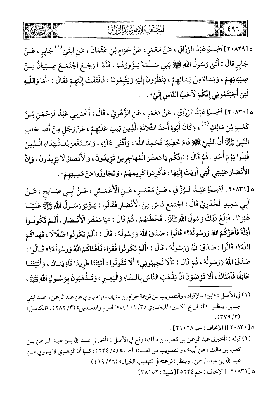 20830- أَخبَرَنا عَبدُ الرَّزَّاقِ، عَنْ مَعْمَرٍ، عَنِ الزُّهْرِيِّ، قَالَ: أَخْبَرَنِي عَبدِ الرَّحْمَنِ بْنِ كَعْبِ بْنِ مَالِكٍ (1)، وَكَانَ أَبوهُ أَحَدَ الثَّلاَثَةِ الَّذِينَ تِيبَ عَلَيْهِمْ، عَن رَجُلٍ مِنْ أَصْحَابِ النَّبِيِّ صَلَّى اللهُ عَلَيْهِ وَسَلَّمَ؛ أَنَّ النَّبِيَّ صَلَّى اللهُ عَلَيْهِ وَسَلَّمَ قَامَ خَطِيبًا، فَحَمِدَ اللهَ، وَأَثْنَى عَلَيْهِ، وَاسْتَغَفَرَ لِلشُّهَدَاءِ الَّذِينَ قُتِلُوا يَوْمَ أُحُدٍ، ثُمَّ قَالَ: إِنَّكُمْ يَا مَعْشَرَ المُهَاجِرِينَ تَزِيدُونَ، وَالأَنْصَارُ لاَ يَزِيدُونَ، وَإِنَّ الأَنْصَارَ عَيْبَتِي الَّتِي أَوَيْتُ إِلَيْهَا، فَأَكْرِمُوا كَرِيمَهُمْ، وَتَجَاوَزُوا مِنْ مُسِيئِهِمْ.