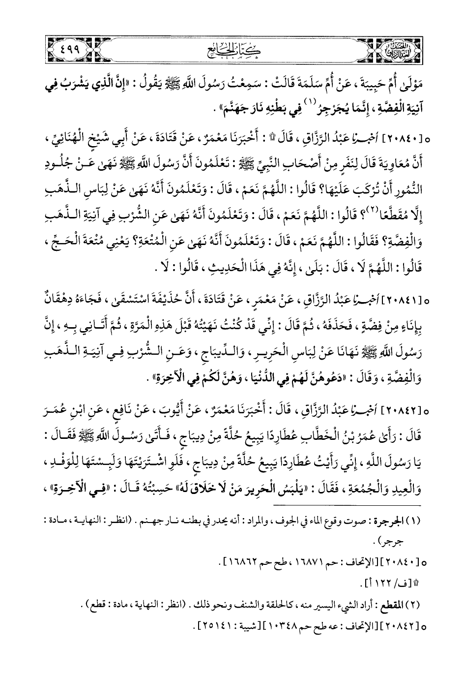 20841- أَخبَرَنا عَبدُ الرَّزَّاقِ، عَنْ مَعْمَرٍ، عَن قَتَادَةَ، أَنَّ حُذَيْفَةَ اسْتَسْقَى، فَجَاءَهُ دِهْقَانٌ بِإِنَاءٍ مِنْ فِضَّةٍ، فَحَذَفَهُ، ثُمَّ قَالَ: إِنِّي قَدْ كُنْتُ نَهَيْتُهُ قَبْلَ هَذِهِ المَرَّةِ، ثُمَّ أَتَانِي بِهِ، إِنَّ رَسُولَ اللهِ صَلَّى اللهُ عَلَيْهِ وَسَلَّمَ نَهَانَا عَن لِبَاسِ الْحَرِيرِ، وَالدِّيبَاجِ، وَعَنِ الشُّرْبِ فِي آنِيَةِ الذَّهَبِ وَالْفِضَّةِ، وَقَالَ: دَعُوهُنَّ لَهُمْ فِي الدُّنْيَا، وَهُنَّ لَكُمْ فِي الآخِرَةِ.