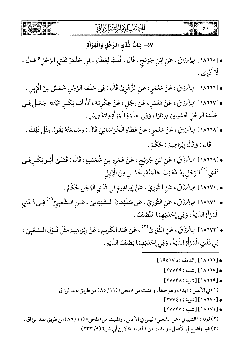 18667- عبد الرزاق، عَنْ مَعْمَرٍ، عَن رَجُلٍ، عَنْ عِكْرِمَةَ، أَنَّ أَبَا بَكْرٍ رَضِي اللهُ عَنْهُ جَعَلَ فِي حَلَمَةِ الرَّجُلِ خَمْسِينَ دِينَارًا، وَفِي حَلَمَةِ المَرْأَةِ مِئَةَ دِينَارٌ.