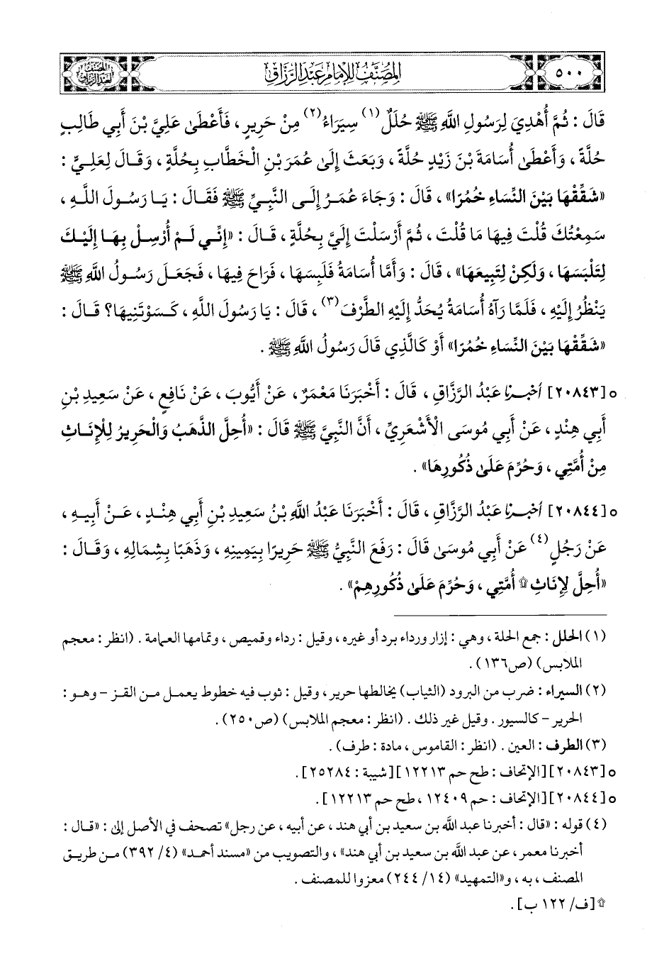 20843- أَخبَرَنا عَبدُ الرَّزَّاقِ، قَالَ: أَخْبَرَنَا مَعْمَرٌ، عَنْ أَيُّوبَ، عَن نَافِعٍ، عَن سَعيدِ بْنِ أَبِي هِنْدٍ، عَنْ أَبِي مُوسَى الأَشْعَرِيِّ، أَنَّ النَّبِيَّ صَلَّى اللهُ عَلَيْهِ وَسَلَّمَ قَالَ: أُحِلَّ الذَّهَبُ وَالْحَرِيرُ لِلإِنَاثِ مِنْ أُمَّتِي، وَحُرِّمَ عَلَى ذُكُورِهَا.