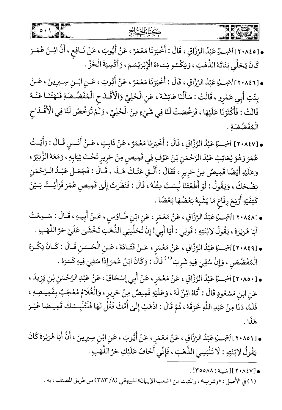 20845- أَخبَرَنا عَبدُ الرَّزَّاقِ، قَالَ: أَخْبَرَنَا مَعْمَرٌ، عَنْ أَيُّوبَ، عَن نَافِعٍ، أَنَّ ابْنَ عُمَرَ كَانَ يُحَلِّي بَنَاتَهُ الذَّهَبَ، وَيَكسُو نِسَاءَهُ الإِبْرَيْسَمَ، وَأَكْسِيَةِ الْخَزِّ.