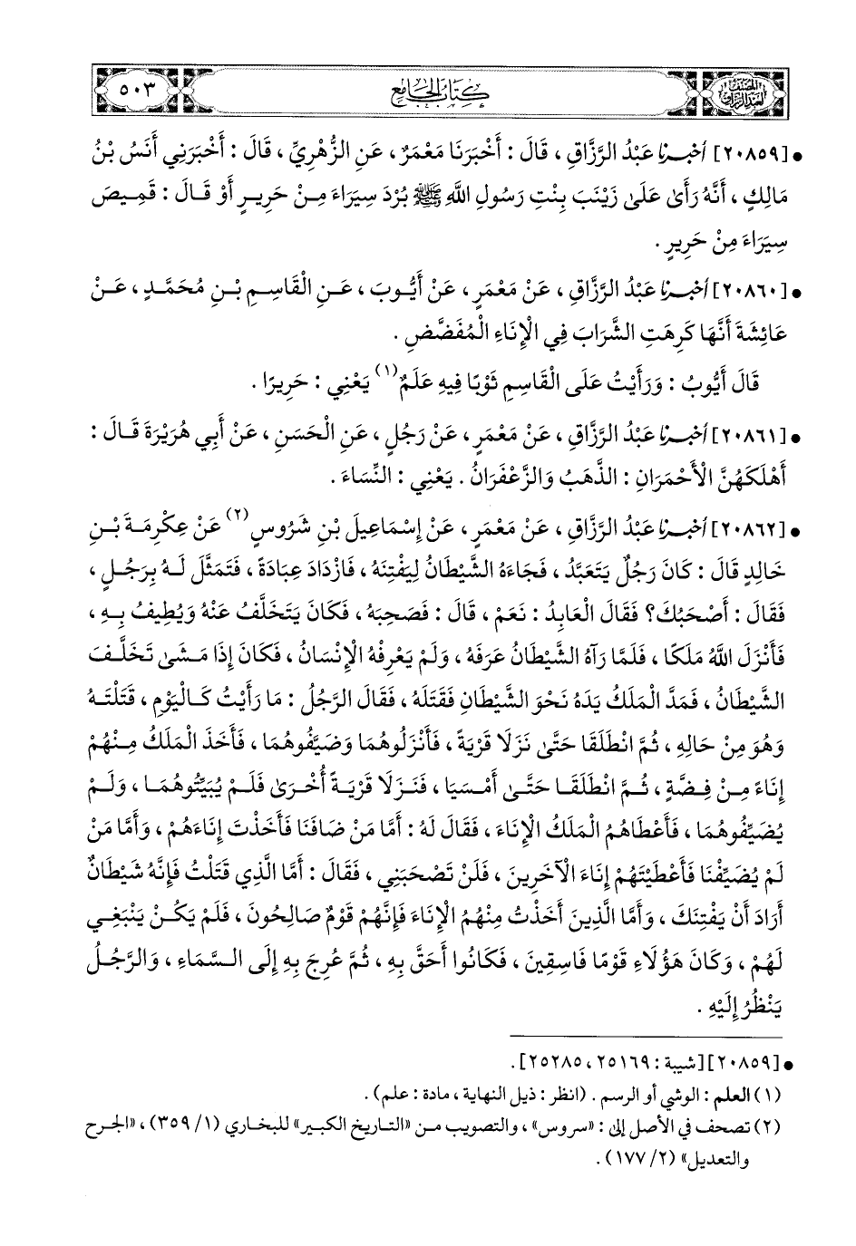 20859- أَخبَرَنا عَبدُ الرَّزَّاقِ، قَالَ: أَخْبَرَنَا مَعْمَرٌ، عَنِ الزُّهْرِيِّ، قَالَ: أَخْبَرَنِي أَنَسُ بن مَالِكٍ، أَنَّهُ رَأَى عَلَى زَيْنَبَ بِنْتِ رَسُولِ اللهِ صَلَّى اللهُ عَلَيْهِ وَسَلَّمَ بُرْدَ سِيَرَاءَ مِنْ حَرِيرٍ، أَوْ قَالَ: قَمِيصَ سِيَرَاءَ مِنْ حَرِيرٍ.