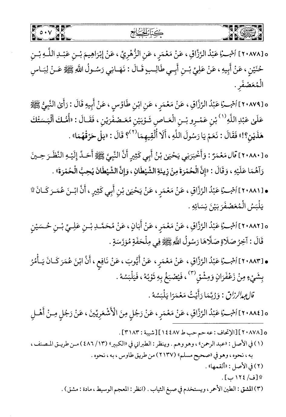 20881- أخبرنا عبد الرزاق، عَنْ مَعْمَرٍ، عَن يَحيَى بنِ أَبِي كَثِيرٍ، أَنَّ ابْنَ عُمَرَ كَانَ يَلْبَسُ المُعَصْفَرَ بَيْنَ نِسَائِهِ.