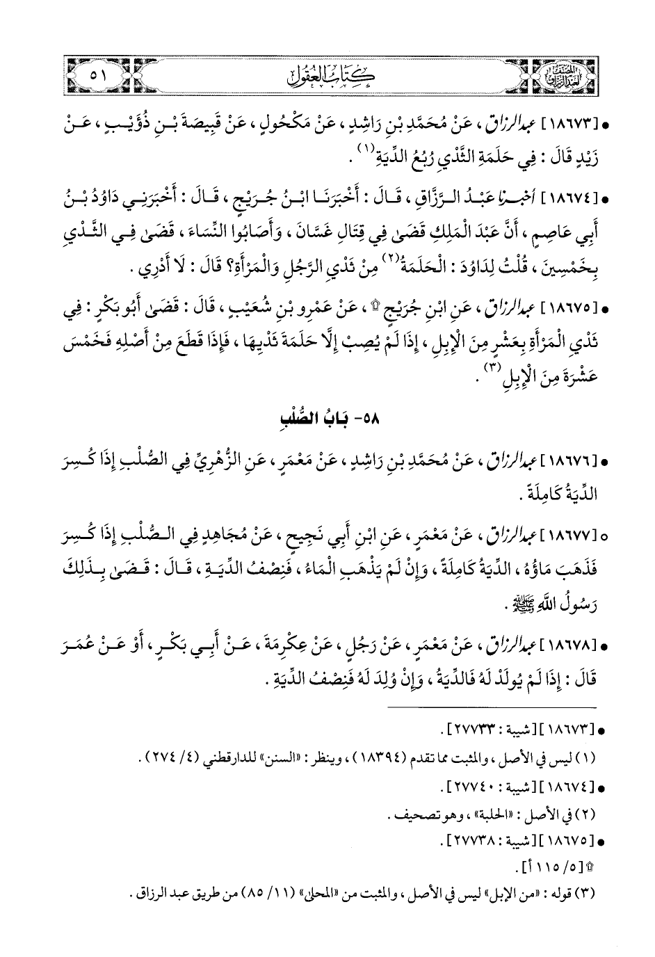 18673- عبد الرزاق، عَن مُحَمَّدِ بْنِ رَاشِدٍ، عَنْ مَكْحُولٍ، عَن قَبِيصَةَ بْنِ ذُؤَيْبٍ، عَن زَيْدٍ، قَالَ: فِي حَلَمَةِ الثَّدْيِ رُبُعُ الدِّيَةِ.