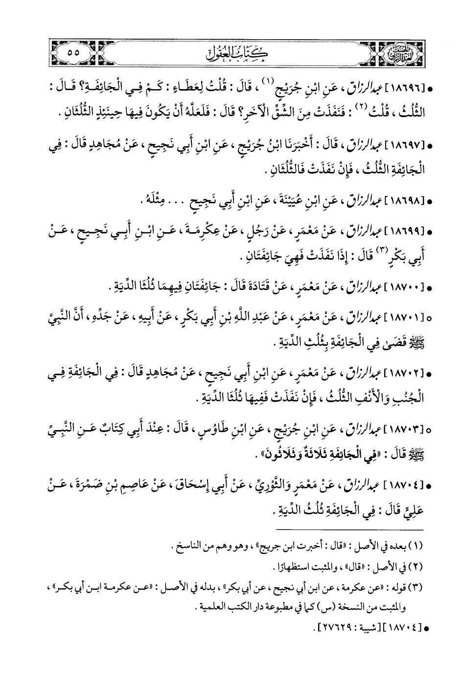 18703- عبد الرزاق، عَنِ ابْنِ جُرَيْجٍ، عَنِ ابْنِ طَاوُوسٍ، قَالَ: عِنْدَ أَبِي كِتَابٌ عَنِ النَّبِيِّ صَلَّى اللهُ عَلَيْهِ وَسَلَّمَ قَالَ: فِي الْجَائِفَةِ ثَلاَثَةً وَثَلاَثُونَ.