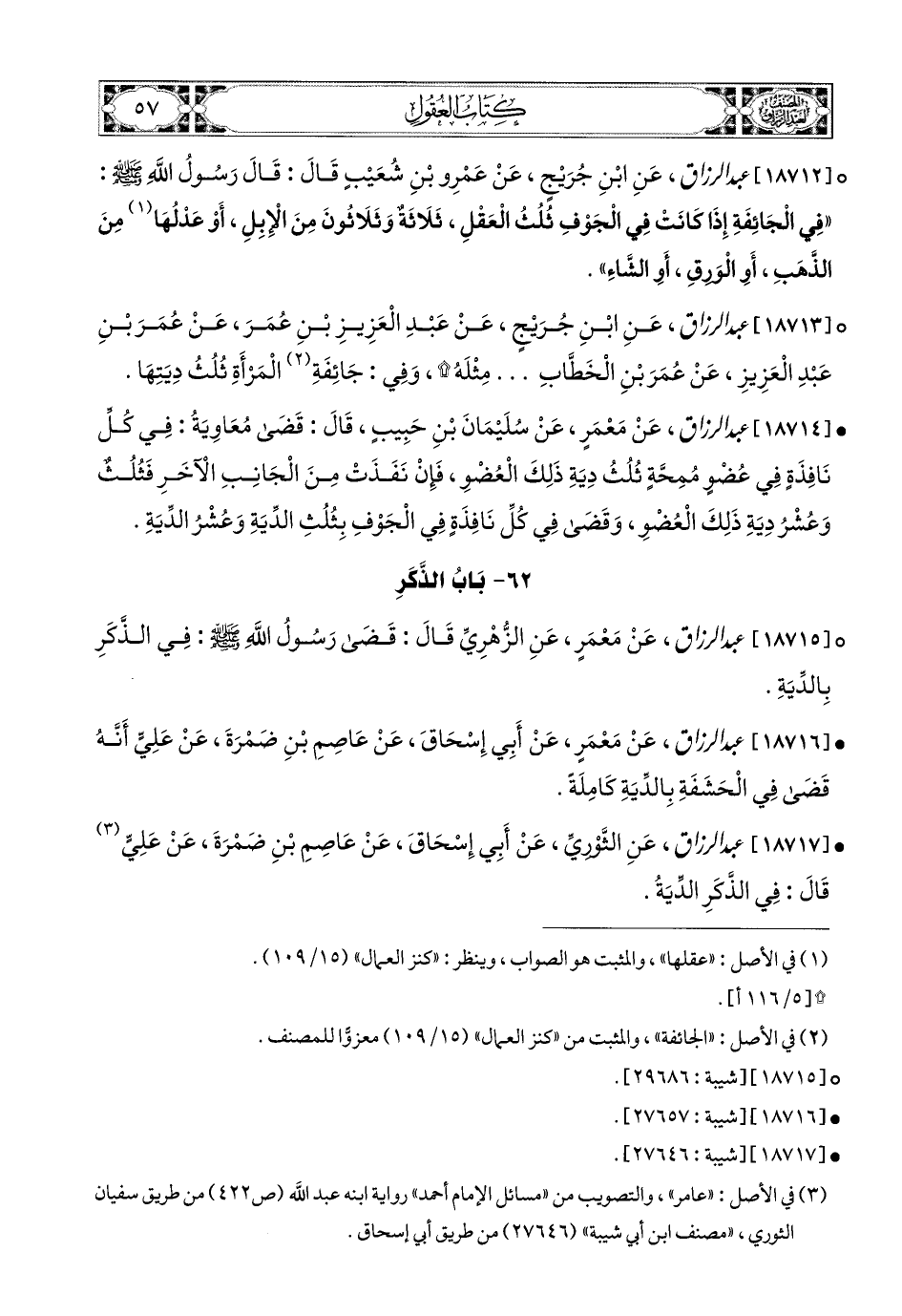 18717- عبد الرزاق، عَنِ الثَّورِيِّ، عَنْ أَبِي إِسْحَاقَ، عَنْ عَاصِمِ بْنِ ضَمْرَةَ، عَنْ عَلِيٍّ، قَالَ: فِي الذَّكَرِ الدِّيَةُ.