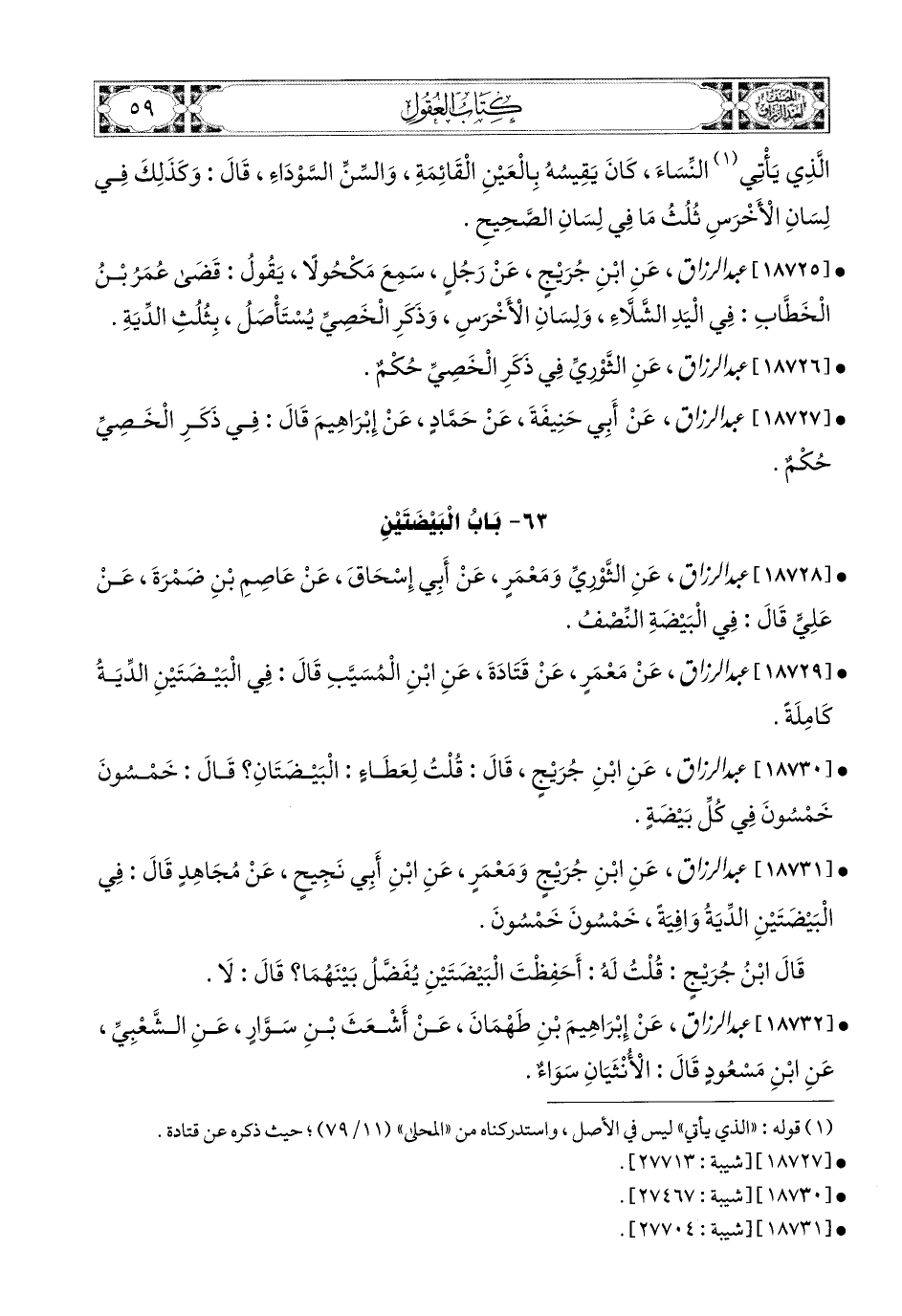 18729- عبد الرزاق، عَنْ مَعْمَرٍ، عَن قَتَادَةَ، عَنِ ابْنِ المُسَيَّبِ، قَالَ: فِي الْبَيْضَتَيْنِ الدِّيَةُ كَامِلَةً.