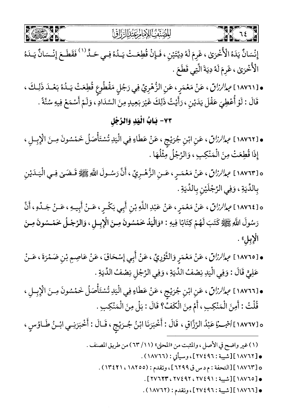 18764- عبد الرزاق، عَنْ مَعْمَرٍ، عَنْ عَبدِ اللهِ بْنِ أَبِي بَكْرٍ، عَنْ أَبِيهِ، عَن جَدِّهِ، أَنَّ رَسُولَ اللهِ صَلَّى اللهُ عَلَيْهِ وَسَلَّمَ كَتَبَ لَهُمْ كِتَابًا فِيهِ، وَالْيَدُ خَمْسُونَ مِنَ الإِبِلِ، وَالرِّجْلُ خَمْسُونَ مِنَ الإِبِلِ.