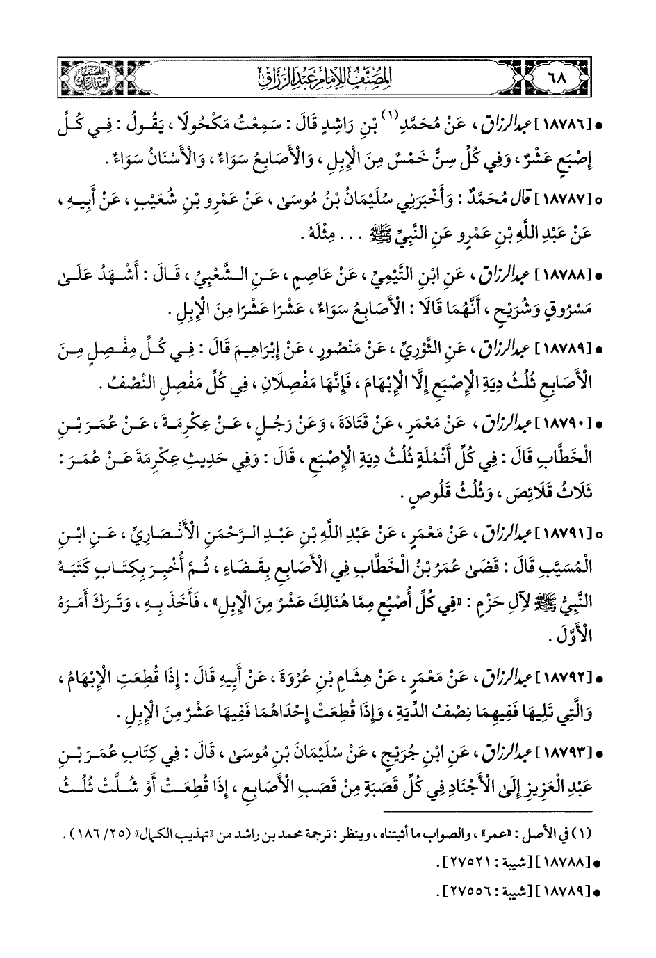 18786- عبد الرزاق، عَن مُحَمَّدِ بْنِ رَاشِدٍ، قَالَ: سَمِعْتُ مَكْحُولاً يَقُولُ: فِي كُلِّ إِصْبَعٍ عَشْرٌ، وَفِي كُلِّ سِنٍّ خَمْسٌ مِنَ الإِبِلِ، وَالأَصَابِعُ سَوَاءٌ، وَالأَسْنَانُ سَوَاءٌ.