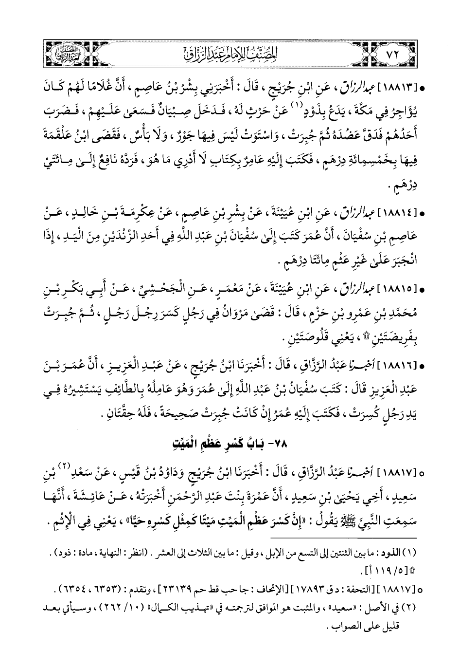 18817- أخبرنا عبد الرزاق، قَالَ: أَخْبَرَنَا ابْنُ جُرَيْجٍ، وَدَاوُدُ بن قَيْسٍ، عَن سَعْدِ (1) بنِ سَعيدٍ، أَخِي يَحيَى بنِ سَعيدٍ، أَنَّ عَمْرَةَ بِنْتَ عَبدِ الرَّحْمَنِ أَخْبَرَتْهُ، عَنْ عَائِشَةَ، أَنَّهَا سَمِعْتِ النَّبِيَّ صَلَّى اللهُ عَلَيْهِ وَسَلَّمَ يَقُولُ: إِنَّ كَسْرَ عَظْمِ المَيِّتِ (2) مَيِّتًا كَمَثَلِ كَسْرِهِ حَيًّا. يَعْنِي فِي الإِثْمِ.