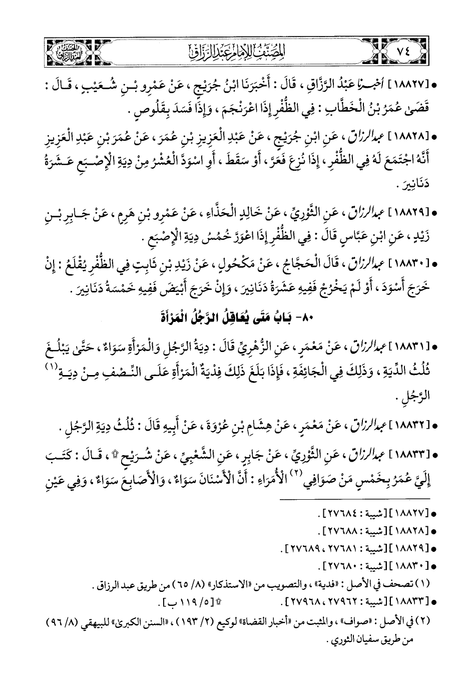 18831- عبد الرزاق، عَنْ مَعْمَرٍ، عَنِ الزُّهْرِيِّ، قَالَ: دِيَةُ الرَّجُلِ وَالمَرْأَةِ سَوَاءٌ، حَتَّى يَبْلُغَ ثُلُثَ الدِّيَةِ، وَذَلِكَ فِي الْجَائِفَةِ، فَإِذَا بَلَغَ ذَلِكَ فَدِيَةُ المَرْأَةِ عَلَى النِّصْفِ مِنْ دِيَةِ الرَّجُلِ.