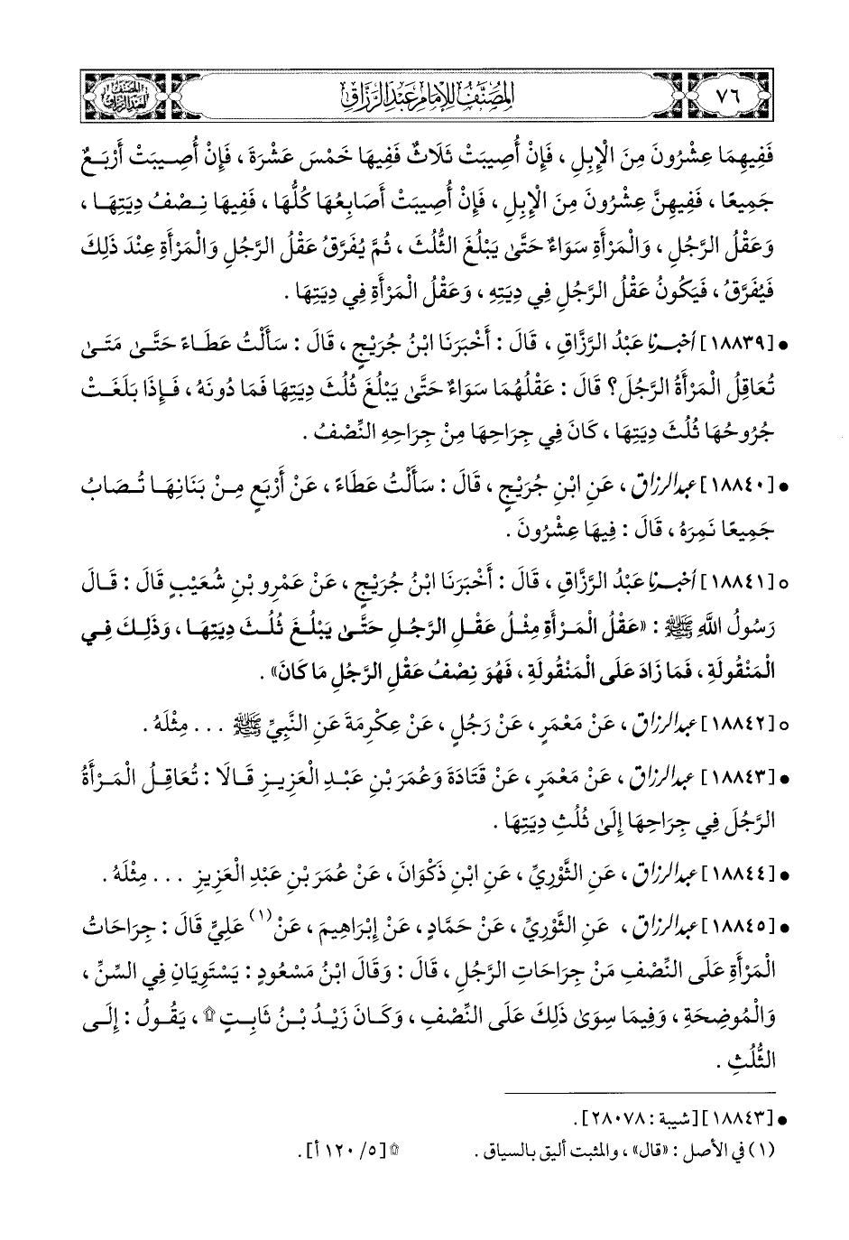 18841- أخبرنا عبد الرزاق، قَالَ: أَخْبَرَنَا ابْنُ جُرَيْجٍ، عَنْ عَمْرِو بنِ شُعَيْبٍ، قَالَ: قَالَ رَسُولُ اللهِ صَلَّى اللهُ عَلَيْهِ وَسَلَّمَ: عَقْلُ المَرْأَةِ مِثْلُ عَقْلِ الرَّجُلِ، حَتَّى يَبْلُغَ ثُلُثَ دِيَتِهِا، وَذَلِكَ فِي المَنْقُولَةِ، فَمَا زَادَ عَلَى المَنْقُولَةِ، فَهُوَ نِصْفُ عَقْلِ الرَّجُلِ مَا كَانَ.