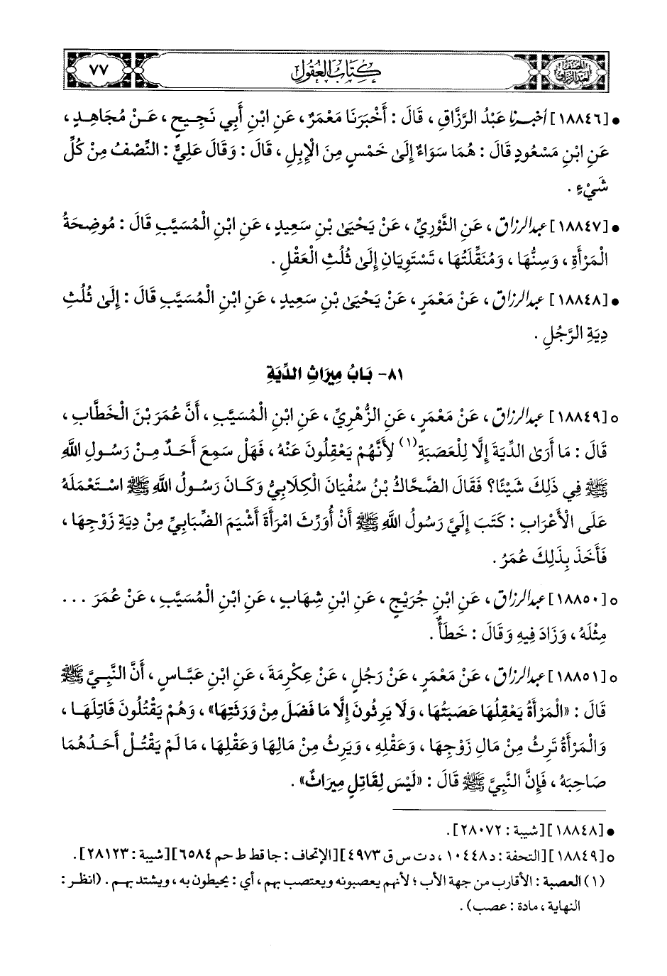18849- عبد الرزاق، عَنْ مَعْمَرٍ، عَنِ الزُّهْرِيِّ، عَنِ ابْنِ المُسَيَّبِ، أَنَّ عُمَرَ بن الْخَطَّابِ قَالَ: مَا أَرَى الدِّيَةَ إِلاَّ لِلْعَصَبَةِ؟ لأَنَّهُمْ يَعْقِلُونَ عَنْهُ، فَهَلْ سَمِعَ أَحَدٌ مِنْ رَسُولِ اللهِ صَلَّى اللهُ عَلَيْهِ وَسَلَّمَ فِي ذَلِكَ شَيْئًا؟ فَقَالَ الضَّحَّاكُ بن سُفْيَانَ الْكِلاَبِيُّ، وَكَانَ رَسُولُ اللهِ صَلَّى اللهُ عَلَيْهِ وَسَلَّمَ اسْتَعْمَلَهُ عَلَى الأَعْرَابِ: كَتَبَ إِلَيَّ رَسُولُ اللهِ صَلَّى اللهُ عَلَيْهِ وَسَلَّمَ أَنْ أُوَرِّثَ امْرَأَةَ أَشْيَمَ الضِّبَابِيِّ مِنْ دِيَةِ زَوْجِهَا، فَأَخَذَ بِذَلِكَ عُمَرُ.
