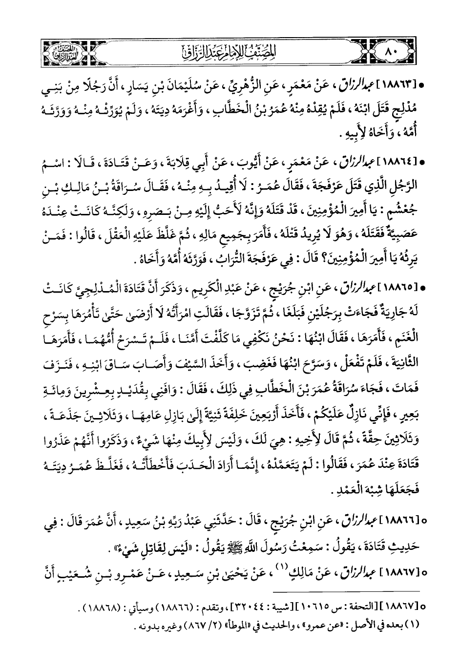 18865- عبد الرزاق، عَنِ ابْنِ جُرَيْجٍ، عَنْ عَبدِ الْكَرِيمِ، وَذَكَرَ أَنَّ قَتَادَةَ المُدْلِجِيَّ، كَانَتْ لَهُ جَارِيَةٌ، فَجَاءَتْ بِرَجُلَيْنِ فَبَلَغَا، ثُمَّ تَزَوَّجَا، فَقَالَتِ امْرَأَتُهُ: لاَ أَرْضَى حَتَّى تَأْمُرَهَا بِسَرْحِ الْغَنَمِ، فَأَمَرَهَا، فَقَالَ ابْنُهَا: نَحْنُ نَكْفِي مَا كَلَّفْتَ أُمَّنَا، فَلَمْ تَسْرَحْ أُمُّهُمَا، فَأَمَرَهَا الثَّانِيَةَ فَلَمْ تَفْعَلْ، وَسَرَّحَ ابْنُهَا، فَغَضِبَ، وَأَخَذَ السَّيْفَ وَأَصَابَ سَاقَ ابْنِهِ، فَنَزَفَ فَمَاتَ، فَجَاءَ سُرَاقَةُ عُمَرَ بن الْخَطَّابِ فِي ذَلِكَ، فَقَالَ: وَافِنِي بِقُدَيْدٍ بِعِشْرِينَ وَمِئَةِ بَعِيرٍ، فَإِنِّي نَازِلٌ عَلَيْكُمْ، فَأَخَذَ أَرْبَعِينَ خَلِفَةً ثَنِيَّةً إِلَى بَازِلِ عَامِهَا، وَثَلاَثِينَ جَذَعَةً، وَثَلاَثِينَ حِقَّةً، ثُمَّ قَالَ لأَخِيه: هِيَ لَكَ، وَلَيْسَ لأَبِيكَ مِنْهَا شَيْءٌ، وَذَكَرُوا أَنَّهُمْ عَذَرُوا قَتَادَةَ عِنْدَ عُمَرَ، فَقَالُوا: لَمْ يَتَعَمَّدْهُ، إِنَّمَا أَرَادَ الْحَدَبَ فَأَخْطَأَتْهُ، فَغَلَّظَ عُمَرُ دِيَتَهُ، فَجَعَلَهَا شِبْهَ الْعَمْدِ.