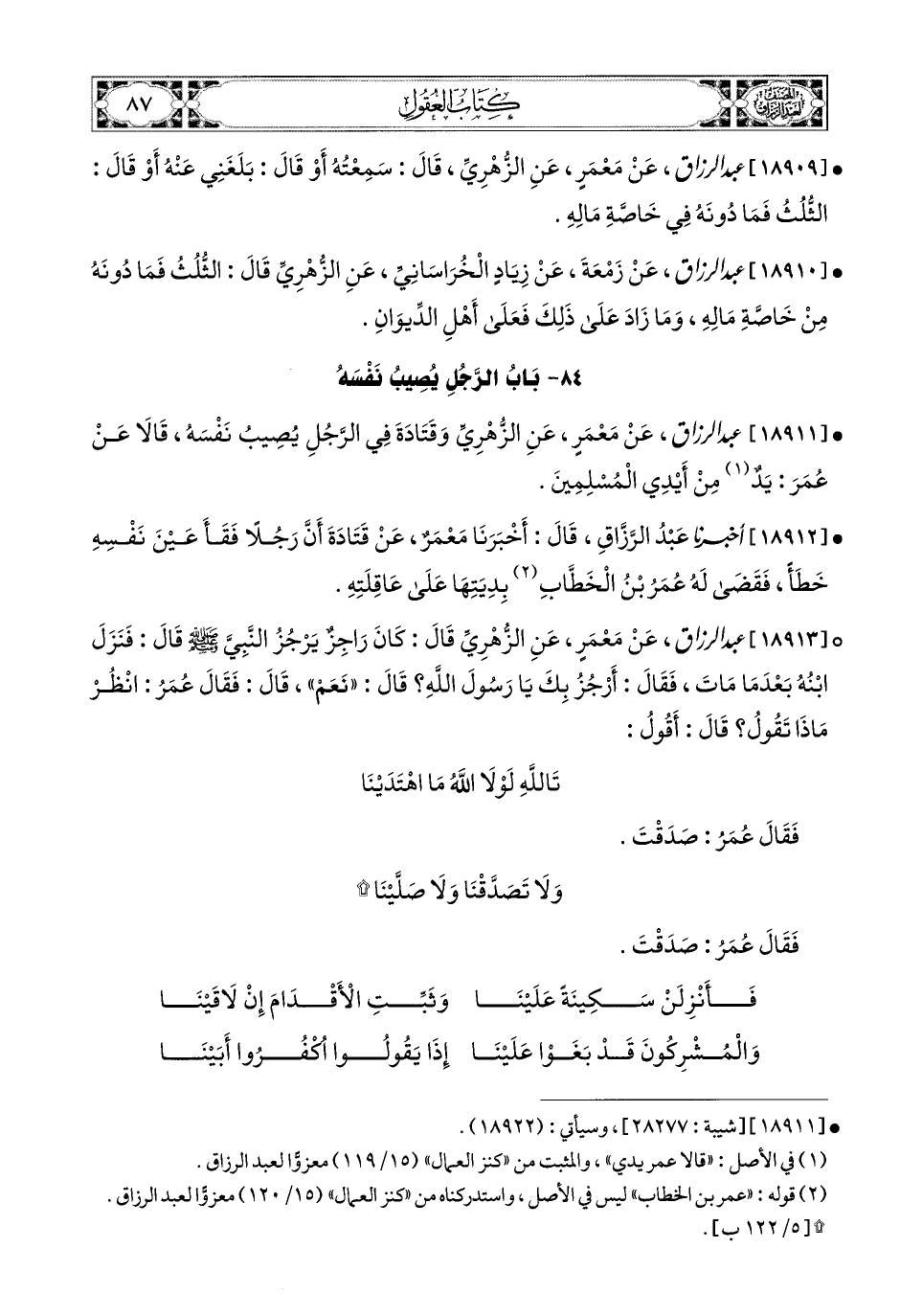 18909- عبد الرزاق، عَنْ مَعْمَرٍ، عَنِ الزُّهْرِيِّ، قَالَ: سَمِعْتُهُ، أَوْ قَالَ: بَلَغَنِي عَنْهُ قَالَ: الثُّلُثُ فَمَا دُونَهُ فِي خَاصَّةِ مَالِهِ.