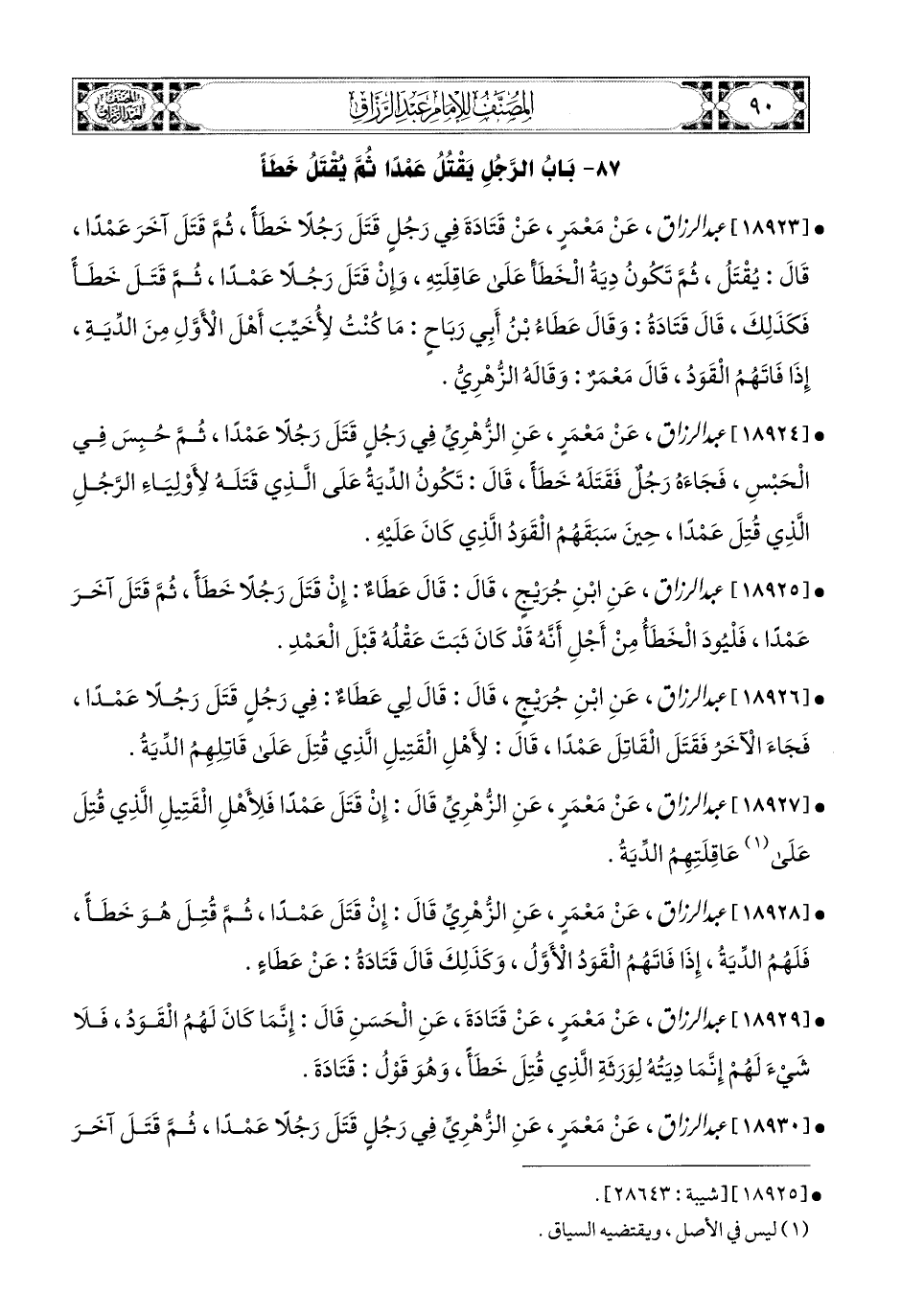 18930- عبد الرزاق، عَنْ مَعْمَرٍ، عَنِ الزُّهْرِيِّ؛ فِي رَجُلٍ قَتَلَ رَجُلاً عَمْدًا، ثُمَّ قَتَلَ آخَرَ خَطَأً قَالَ: يُقْتَلُ بِهِ، وَتَكُونُ الدِّيَةُ لِلأَوَّلِينَ عَلَى هَؤُلاَءِ الَّذِينَ اسْتَقَادُوا مِنْ صَاحِبِهِمْ.