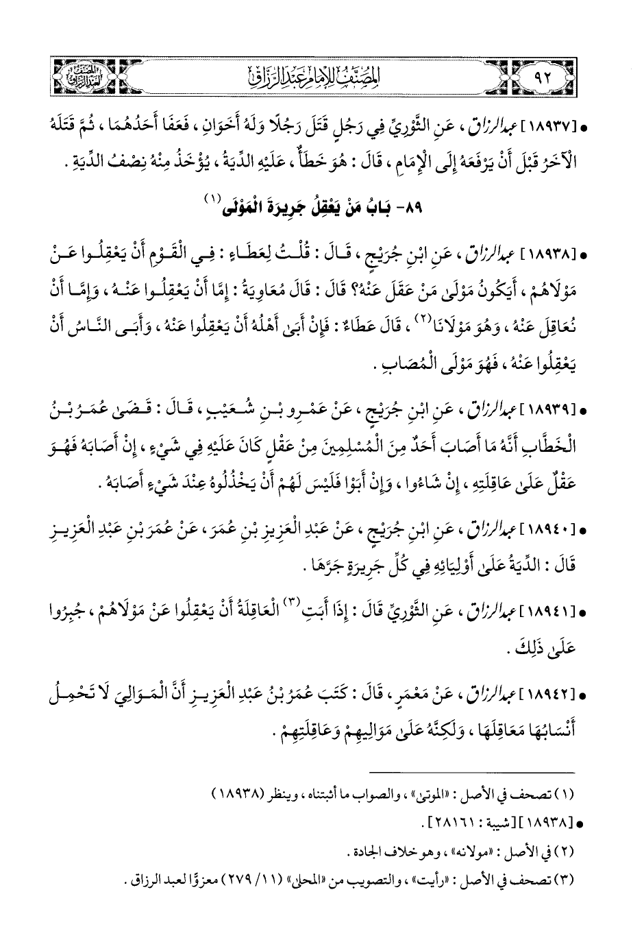 18938- عبد الرزاق، عَنِ ابْنِ جُرَيْجٍ، قَالَ: قُلْتُ لِعَطَاءٍ: فِي الْقَوْمُ أَنْ يَعْقِلُوا عَنْ مَوْلاَهُمْ أَيَكُونُ مَوْلَى مَنْ عَقَلَ عَنْهُ؟ قَالَ: قَالَ مُعَاوِيَةُ: إِمَّا أَنْ يَعْقِلُوا عَنْهُ، وَإِمَّا أَنْ نُعَاقِلَ عَنْهُ، وَهُوَ مَوْلاَنَا، قَالَ عَطَاءٌ: فَإِنْ أَبَى أَهْلُهُ أَنْ يَعْقِلُوا عَنْهُ، وَأَبَى النَّاسُ أَنْ يَعْقِلُوا عَنْهُ، فَهُوَ مَوْلَى المُصَابِ.