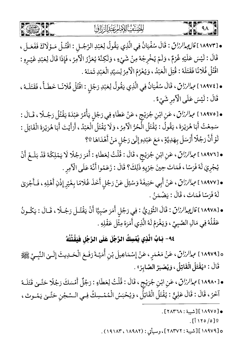 18974- عبد الرزاق، قَالَ سُفْيَانُ: فِي الَّذِي يَقُولُ لِعَبْدِ رَجُلٍ: اقْتُلْ فُلاَنًا خَطَأً فَقَتَلَهُ، قَالَ: لَيْسَ عَلَى الآمِرِ شَيْءٌ.