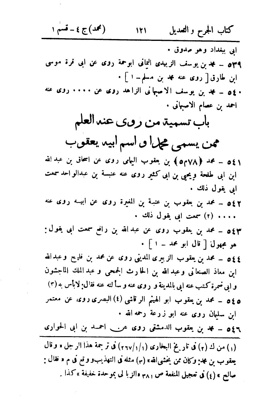 - باب تسمية من رَوَى عَنه العلم، مِمَّن يُسَمَّى مُحَمدًا، واسم أَبيه يعقوب.