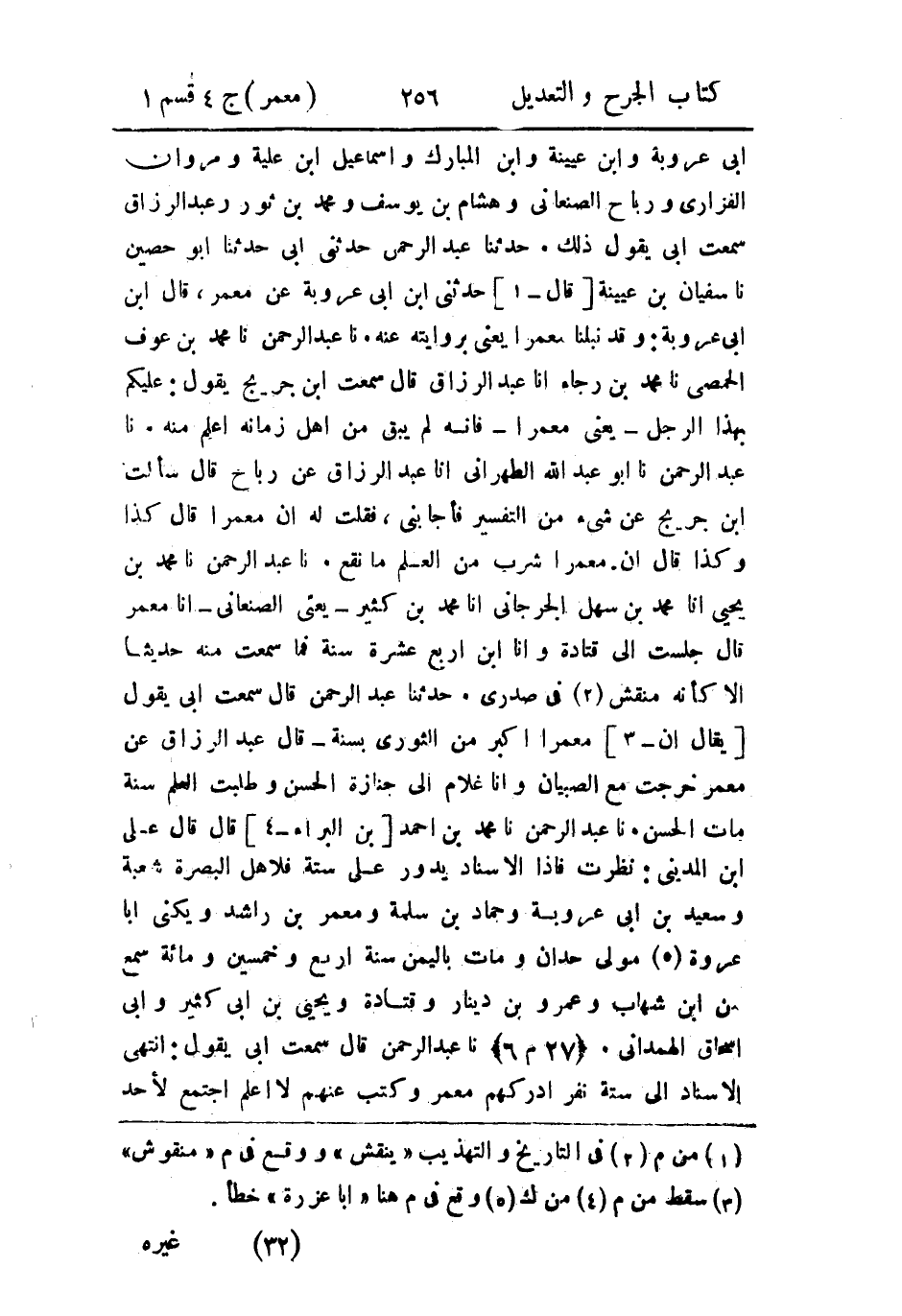 حَدثنا عَبد الرَّحمن، حَدثنا محمد بن أَحمد بن البراء قال: قال عَلي بن المَديني: نظرت، فإذا الإِسناد يدور على ستة، فَلأهل البصرة: شُعبة، وسَعيد بن أَبي عَرُوبَة، وحَماد بن سلمة، ومَعْمَر بن راشد ويُكنى أَبَا عُروَة مولى حدان، ومات باليمن سنة أربع وخمسين ومِئَة، سمع من ابن شهاب، وعَمرو بن دينار وقتادة، ويَحيي بن أَبي كثير، وأبي إِسحاق الهمداني.