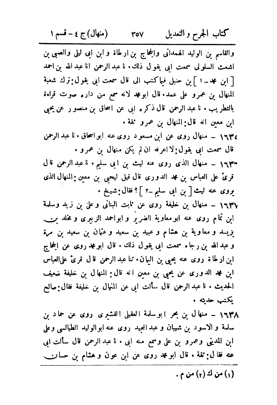 حَدثنا عَبد الرَّحمن قال: قُرِئَ عَلَى العباس بن محمد الدُّوري، قال: قيل ليحيى بن مَعين: المنهال الذي يروي عنه ليث بن أَبي سليم؟ فقال: شيخ.