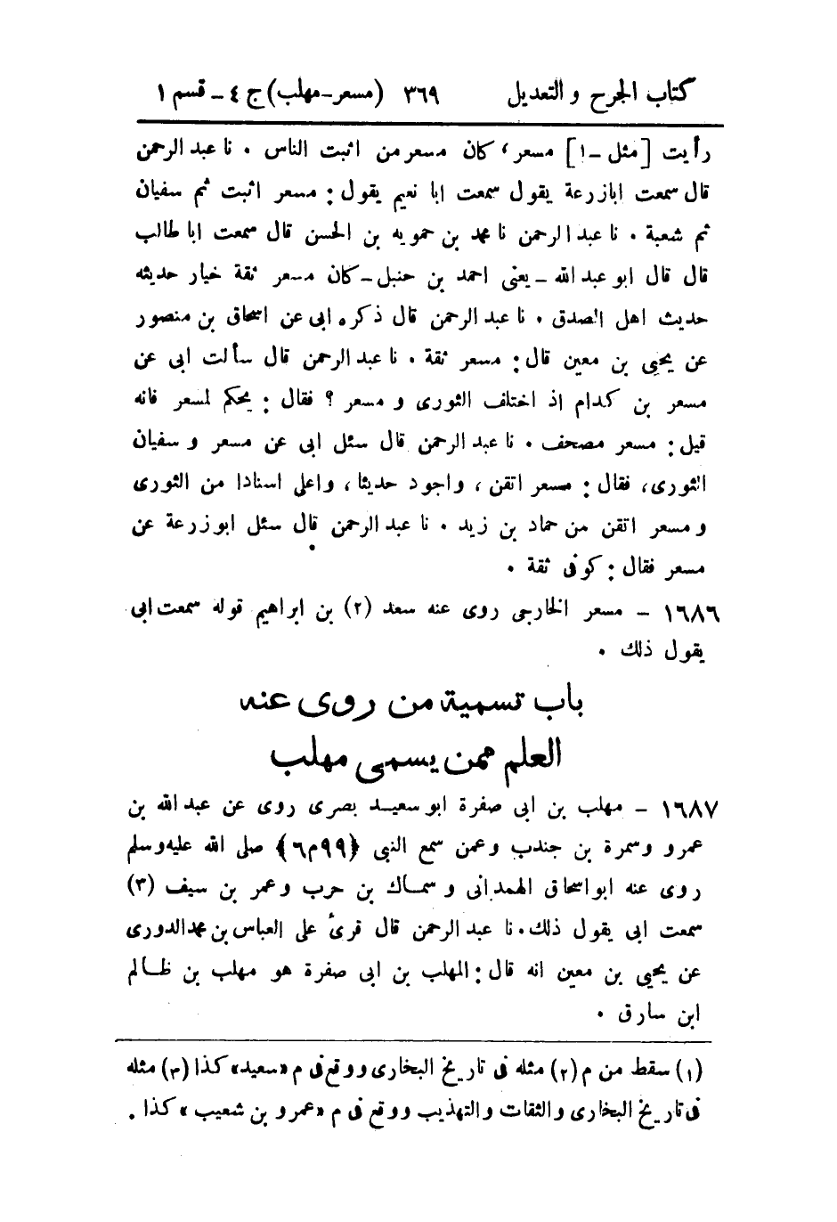 حَدثنا عَبد الرَّحمن، قال: سَألتُ أَبي عن مِسْعَر بن كدام، إذ اختلف الثَّوري، ومِسْعَر؟ فقال: يُحْكَم لمسعر، فإِنه قيل: مِسْعَر مصحف.