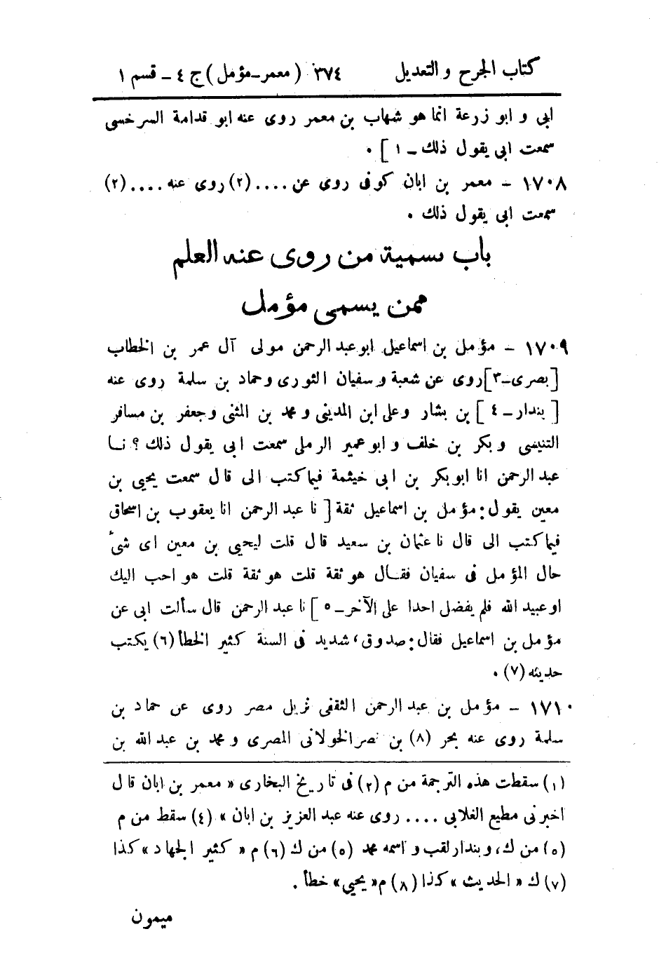 - باب تسمية من رُوي عنه العلم، مِمَّن يُسَمَّى مُؤَمَّل.